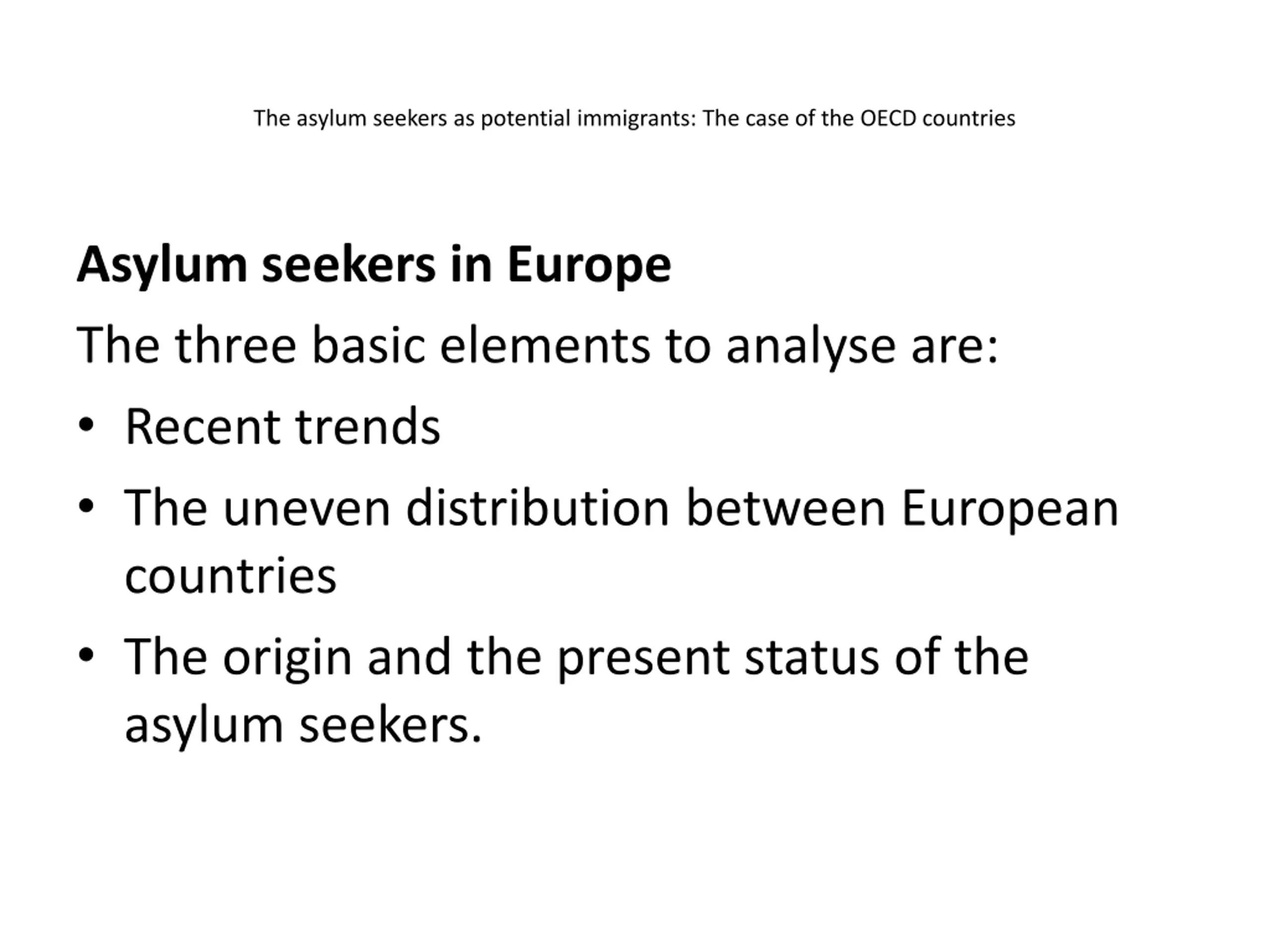 The asylum seekers as potential immigrants: The case of the OECD countries Asylum seekers in Europe The three basic elements to analyse are: Recent trends The uneven distribution between European countries The origin and the present status of the asylum seekers.