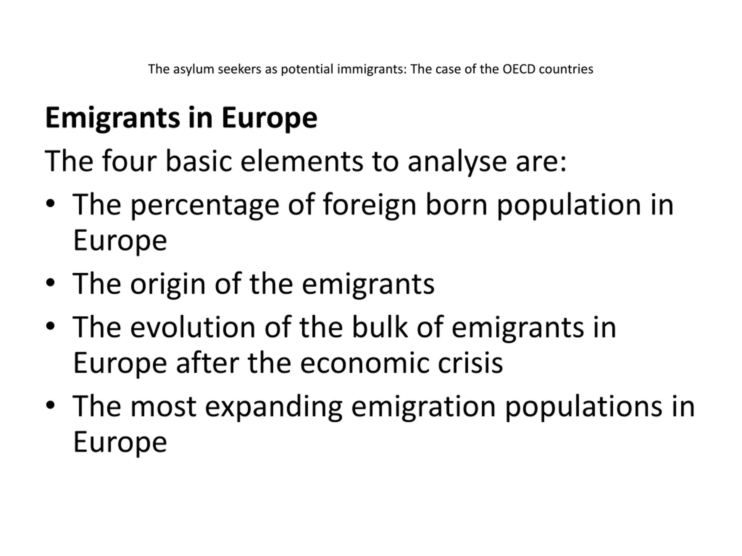 The asylum seekers as potential immigrants: The case of the OECD countries Emigrants in Europe The four basic elements to analyse are: The percentage of foreign born population in Europe The origin of the emigrants The evolution of the bulk of emigrants in Europe after the economic crisis The most expanding emigration populations in Europe