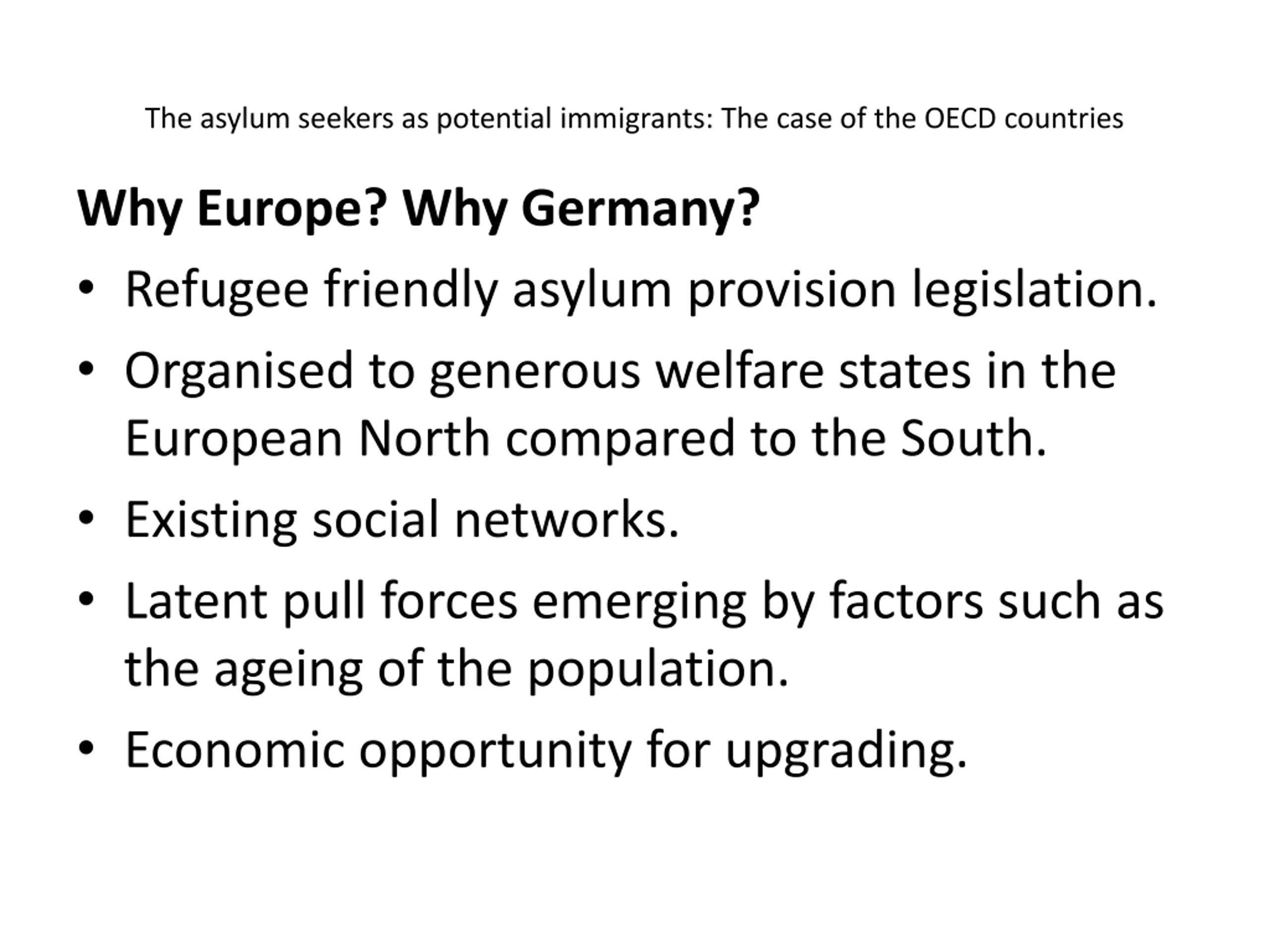 The asylum seekers as potential immigrants: The case of the OECD countries Why Europe? Why Germany? Refugee friendly asylum provision legislation. Organised to generous welfare states in the European North compared to the South. Existing social networks. Latent pull forces emerging by factors such as the ageing of the population. Economic opportunity for upgrading.