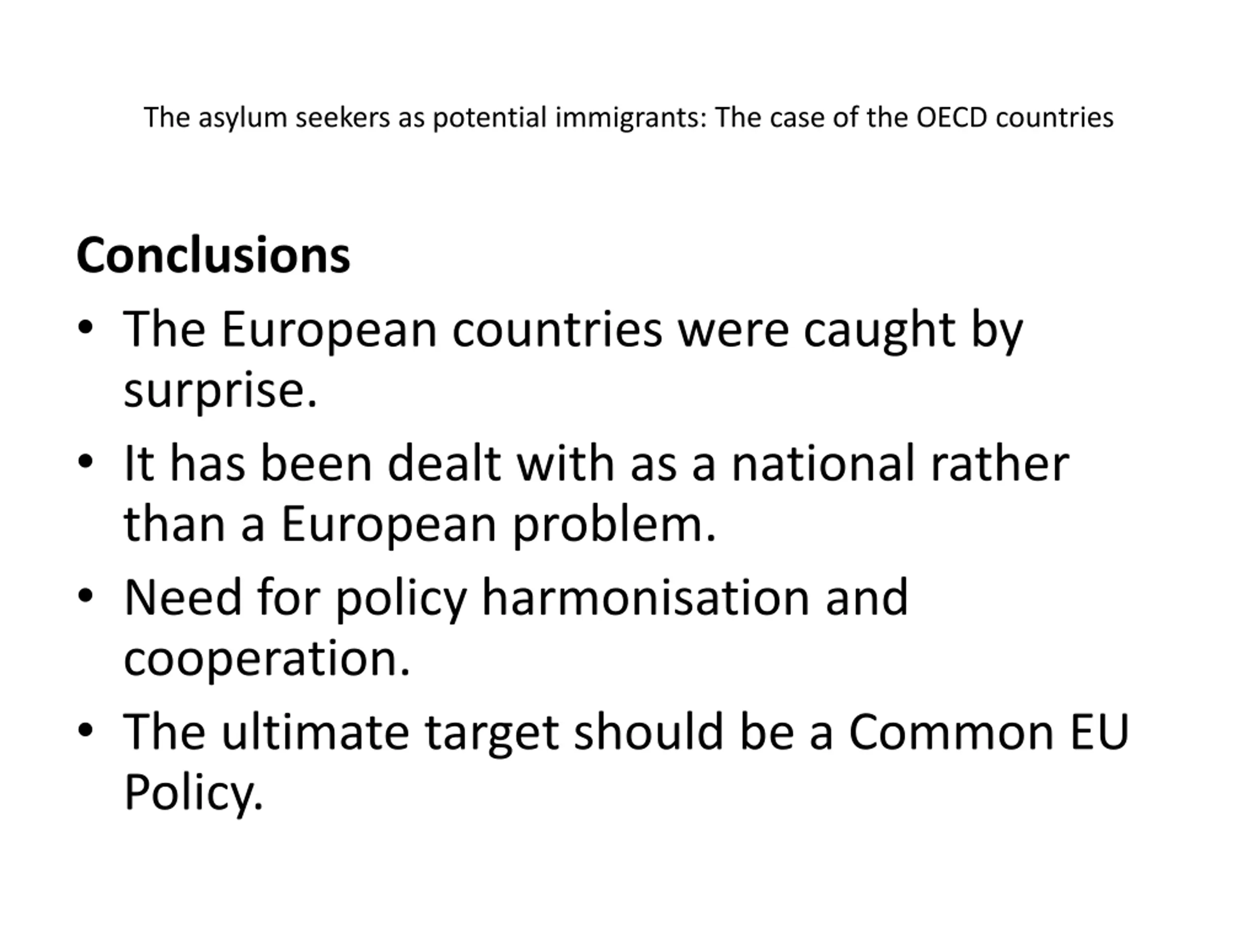 The asylum seekers as potential immigrants: The case of the OECD countries Conclusions The European countries were caught by surprise. It has been dealt with as a national rather than a European problem. Need for policy harmonisation and cooperation. The ultimate target should be a Common EU Policy.