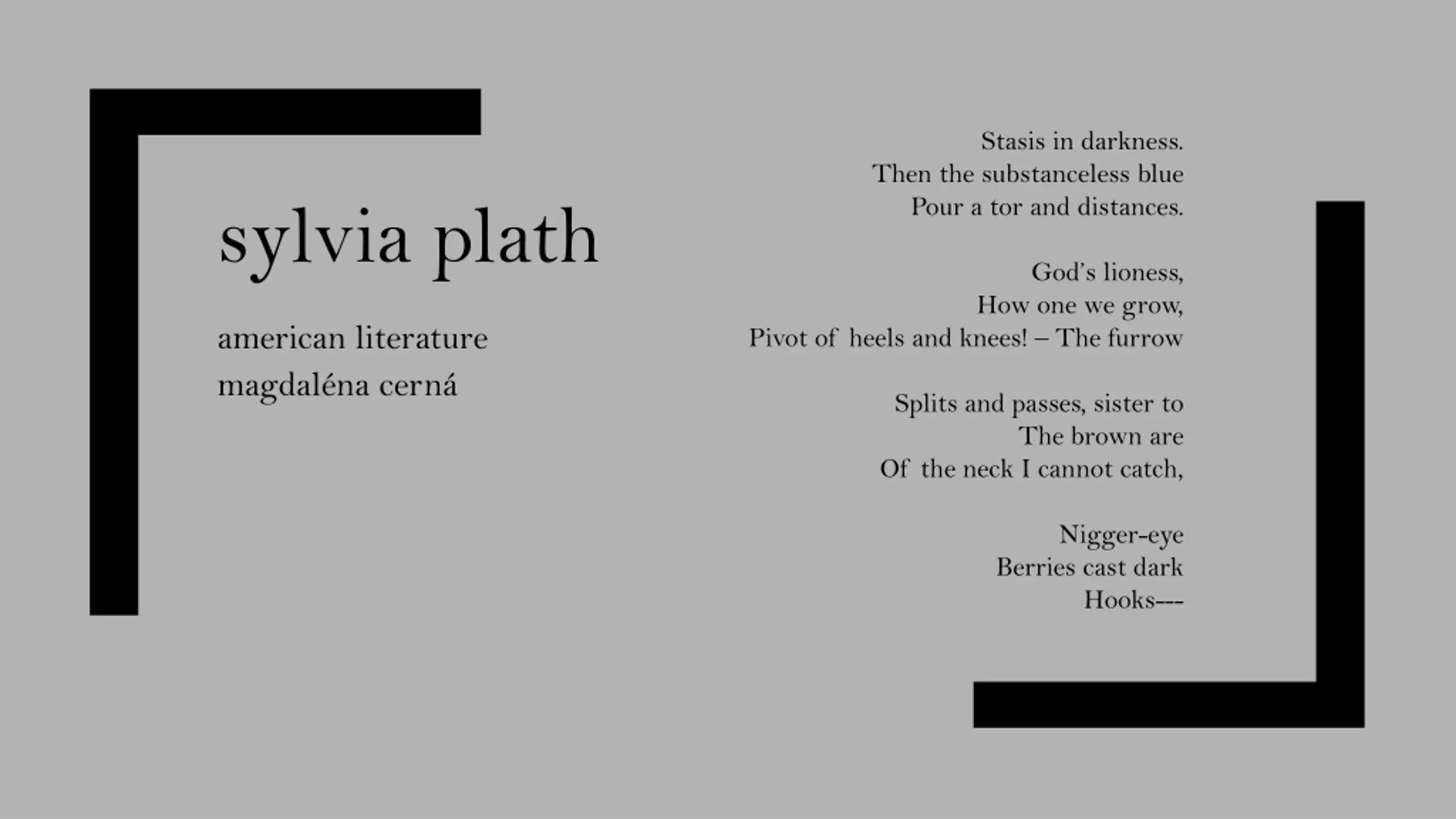 Stasis in darkness. Then the substanceless blue Pour a tor and distances. sylvia plath God s lioness, How one we grow, american literature magdal na cern Pivot of heels and knees! The furrow Splits and passes, sister to The brown are Of the neck I cannot catch, Nigger-eye Berries cast dark Hooks---