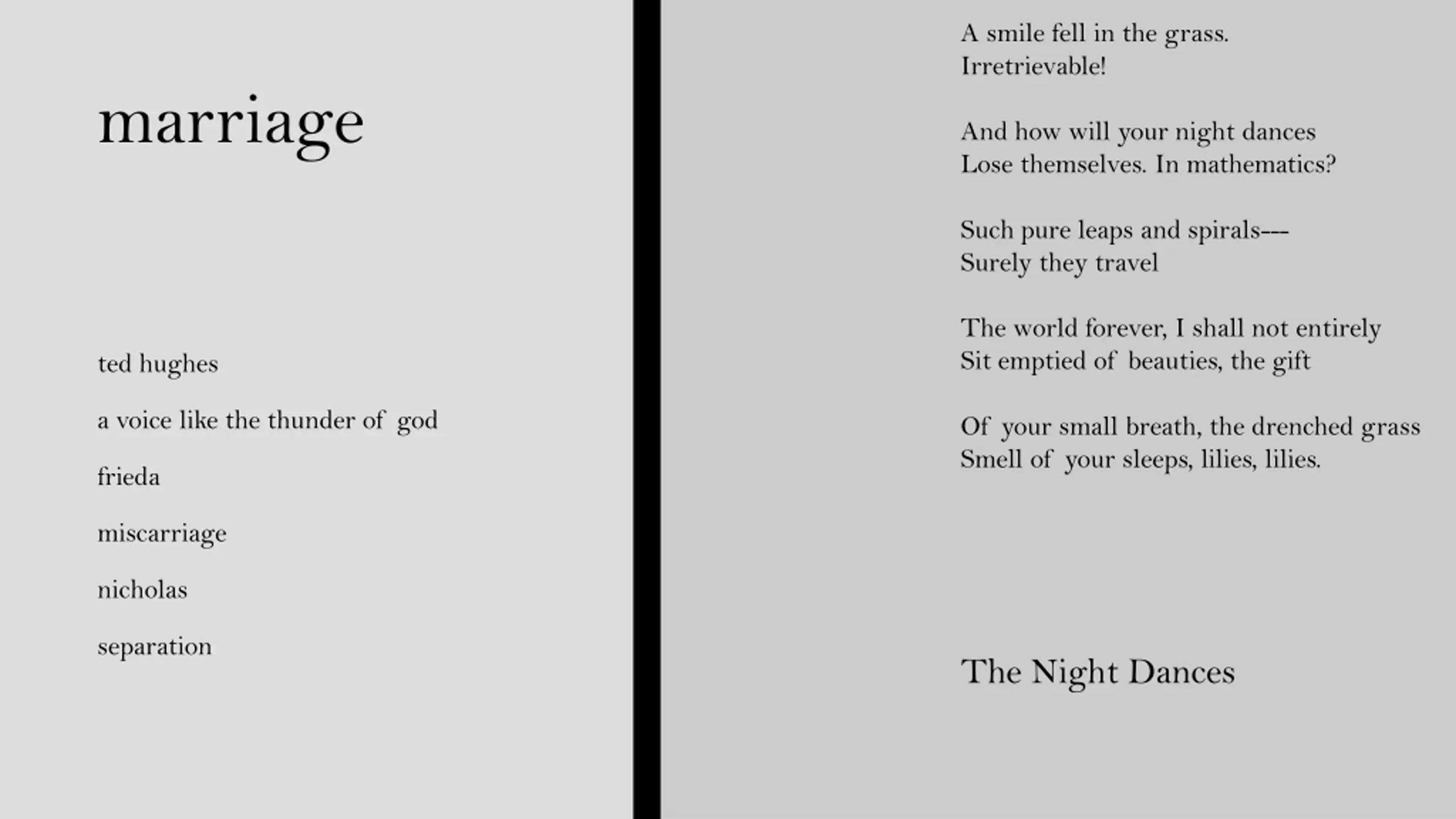 A smile fell in the grass. Irretrievable! marriage And how will your night dances Lose themselves. In mathematics? Such pure leaps and spirals--- Surely they travel The world forever, I shall not entirely Sit emptied of beauties, the gift ted hughes a voice like the thunder of god Of your small breath, the drenched grass Smell of your sleeps, lilies, lilies. frieda miscarriage nicholas separation The Night Dances