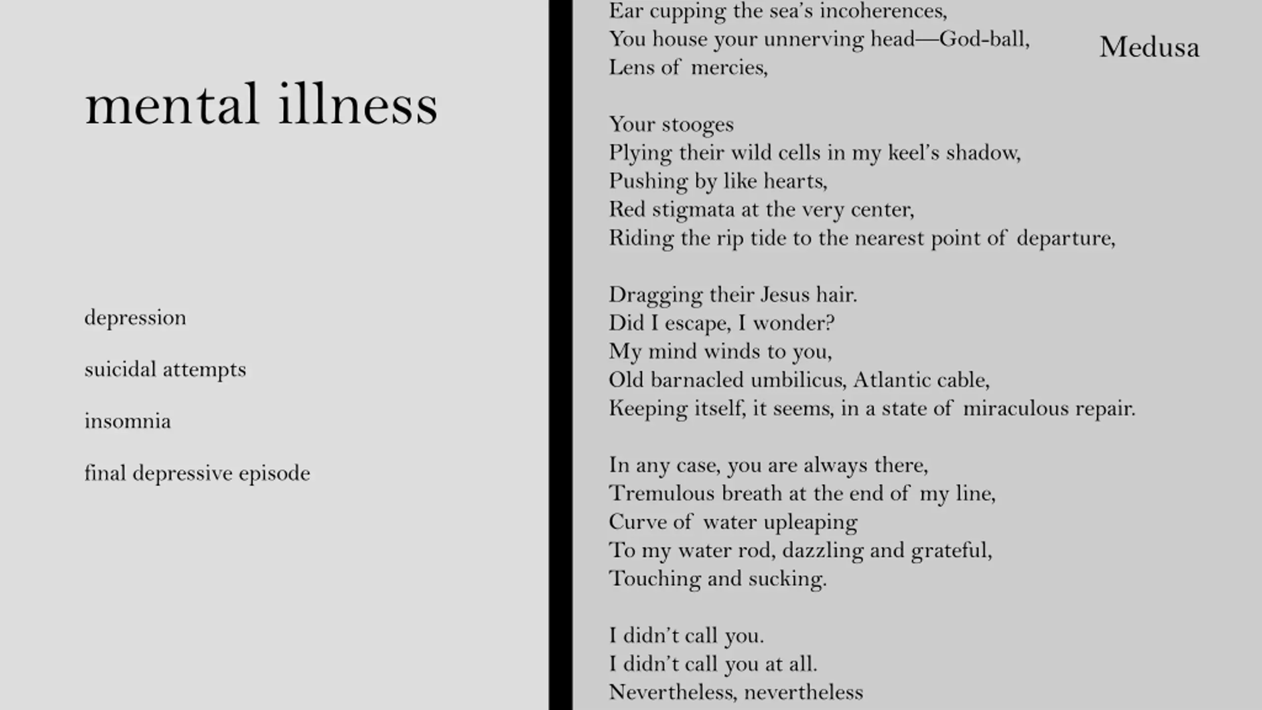 Ear cupping the seas incoherences, You house your unnerving head God-ball, Lens of mercies, Medusa mental illness Your stooges Plying their wild cells in my keel s shadow, Pushing by like hearts, Red stigmata at the very center, Riding the rip tide to the nearest point of departure, Dragging their Jesus hair. Did I escape, I wonder? My mind winds to you, Old barnacled umbilicus, Atlantic cable, Keeping itself, it seems, in a state of miraculous repair. depression suicidal attempts insomnia In any case, you are always there, Tremulous breath at the end of my line, Curve of water upleaping To my water rod, dazzling and grateful, Touching and sucking. final depressive episode I didn t call you. I didn t call you at all. Nevertheless, nevertheless