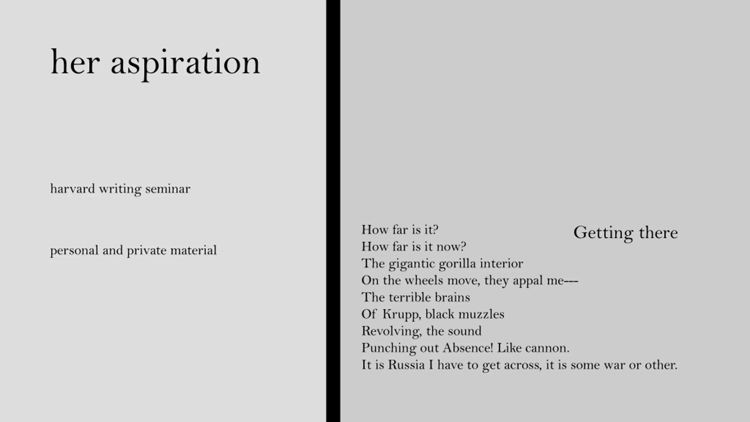 her aspiration harvard writing seminar How far is it? How far is it now? The gigantic gorilla interior On the wheels move, they appal me--- The terrible brains Of Krupp, black muzzles Revolving, the sound Punching out Absence! Like cannon. It is Russia I have to get across, it is some war or other. Getting there personal and private material