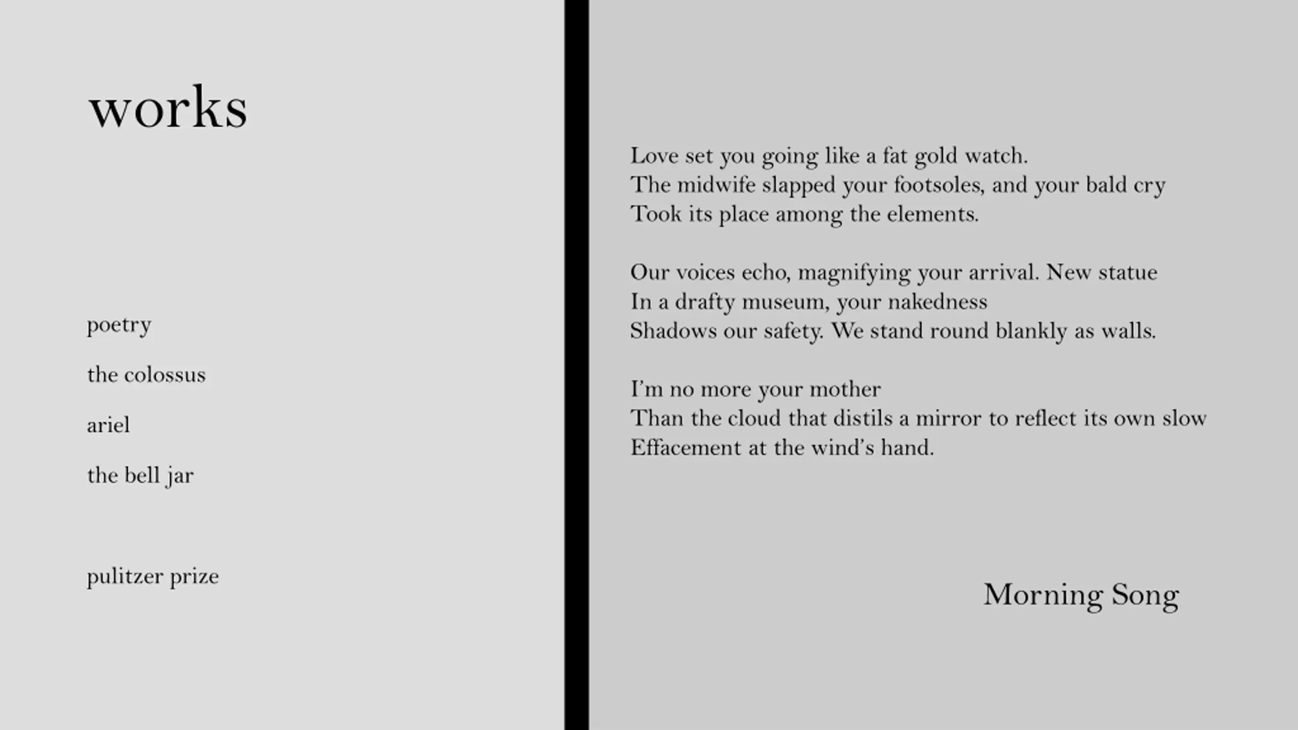 works Love set you going like a fat gold watch. The midwife slapped your footsoles, and your bald cry Took its place among the elements. Our voices echo, magnifying your arrival. New statue In a drafty museum, your nakedness Shadows our safety. We stand round blankly as walls. poetry the colossus I m no more your mother Than the cloud that distils a mirror to reflect its own slow Effacement at the wind s hand. ariel the bell jar pulitzer prize Morning Song