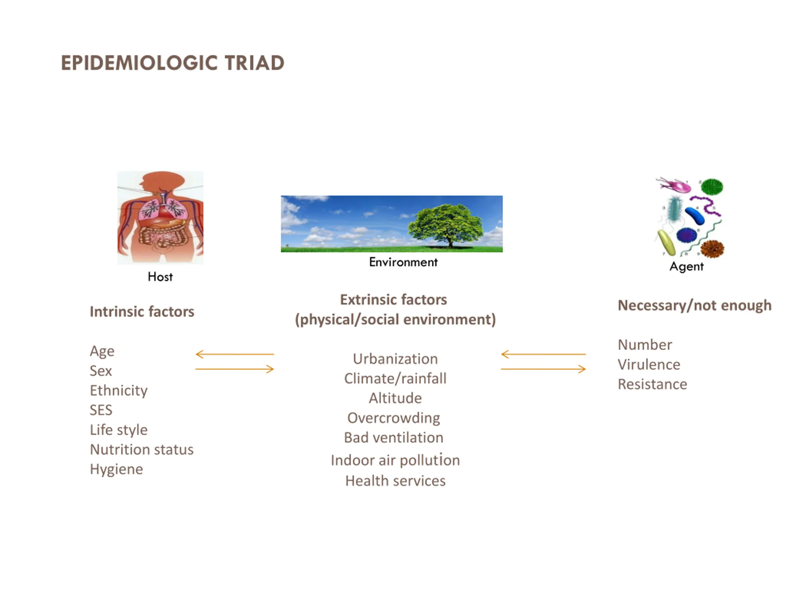 EPIDEMIOLOGIC TRIAD Environment Agent Host Extrinsic factors (physical/social environment) Necessary/not enough Intrinsic factors Number Virulence Resistance Age Sex Ethnicity SES Life style Nutrition status Hygiene Urbanization Climate/rainfall Altitude Overcrowding Bad ventilation Indoor air pollution Health services