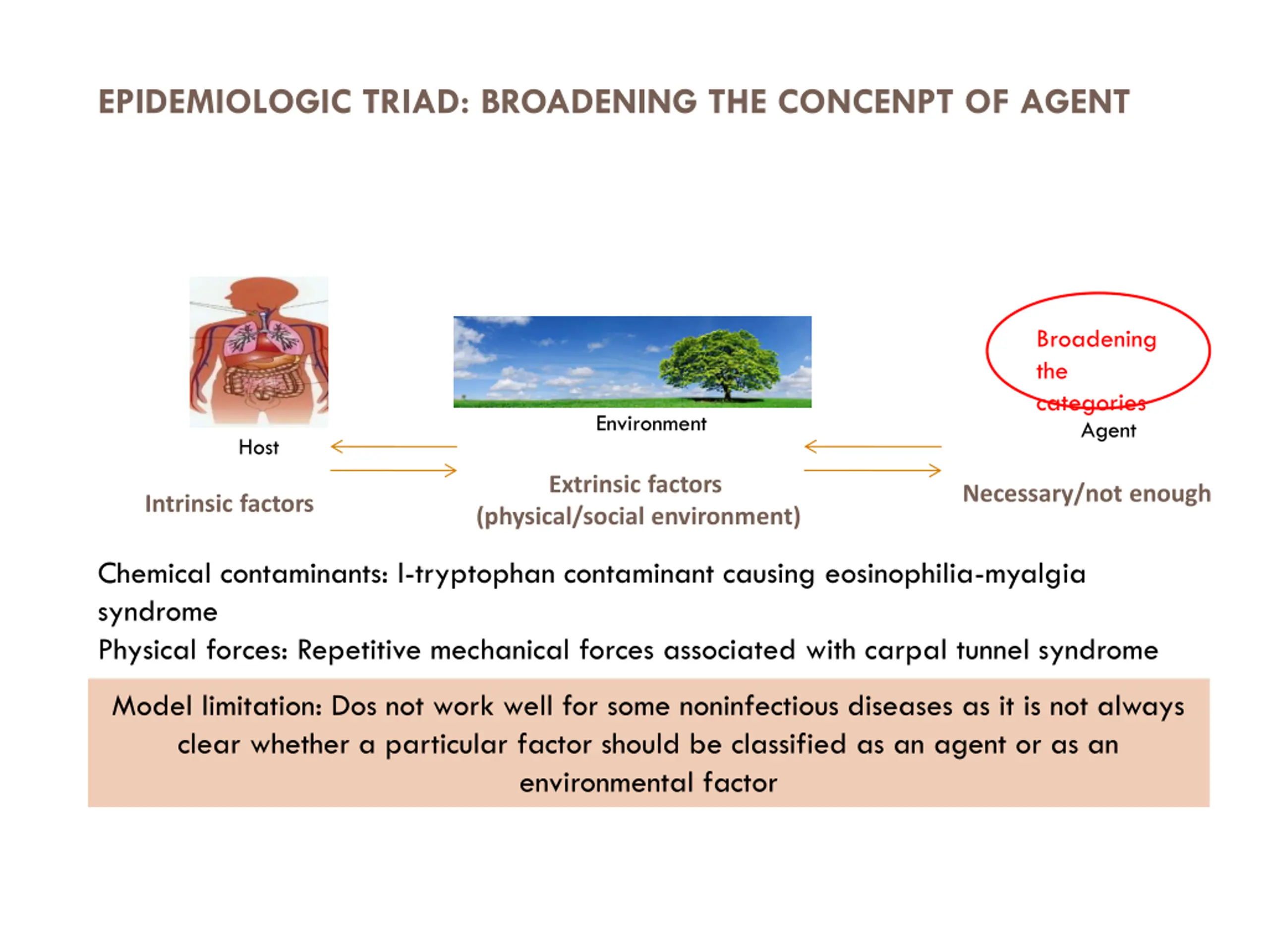 EPIDEMIOLOGIC TRIAD: BROADENING THE CONCENPT OF AGENT Broadening the categories Environment Agent Host Extrinsic factors (physical/social environment) Necessary/not enough Intrinsic factors Chemical contaminants: l-tryptophan contaminant causing eosinophilia-myalgia syndrome Physical forces: Repetitive mechanical forces associated with carpal tunnel syndrome Model limitation: Dos not work well for some noninfectious diseases as it is not always clear whether a particular factor should be classified as an agent or as an environmental factor