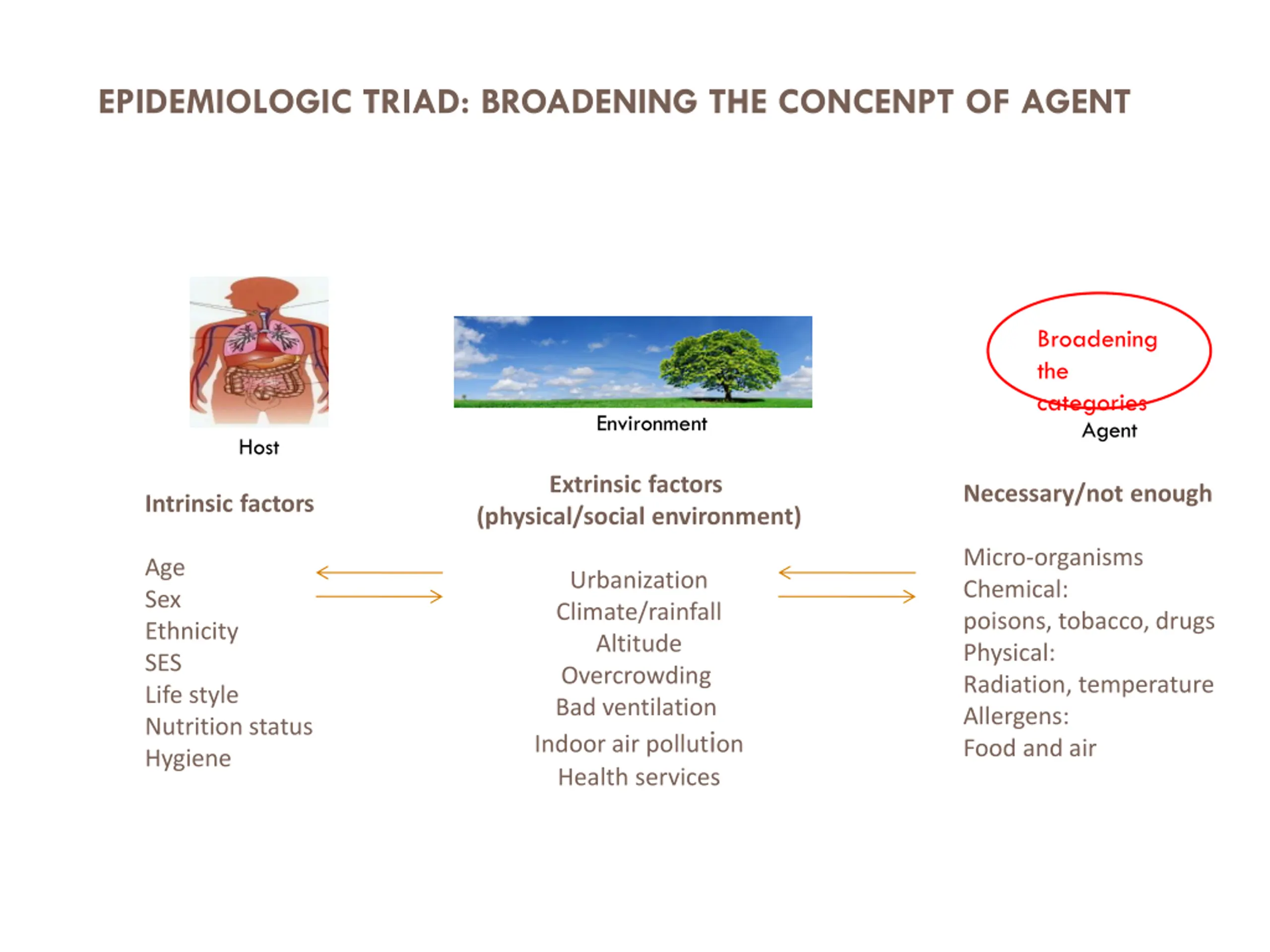 EPIDEMIOLOGIC TRIAD: BROADENING THE CONCENPT OF AGENT Broadening the categories Environment Agent Host Extrinsic factors (physical/social environment) Necessary/not enough Intrinsic factors Micro-organisms Chemical: poisons, tobacco, drugs Physical: Radiation, temperature Allergens: Food and air Age Sex Ethnicity SES Life style Nutrition status Hygiene Urbanization Climate/rainfall Altitude Overcrowding Bad ventilation Indoor air pollution Health services