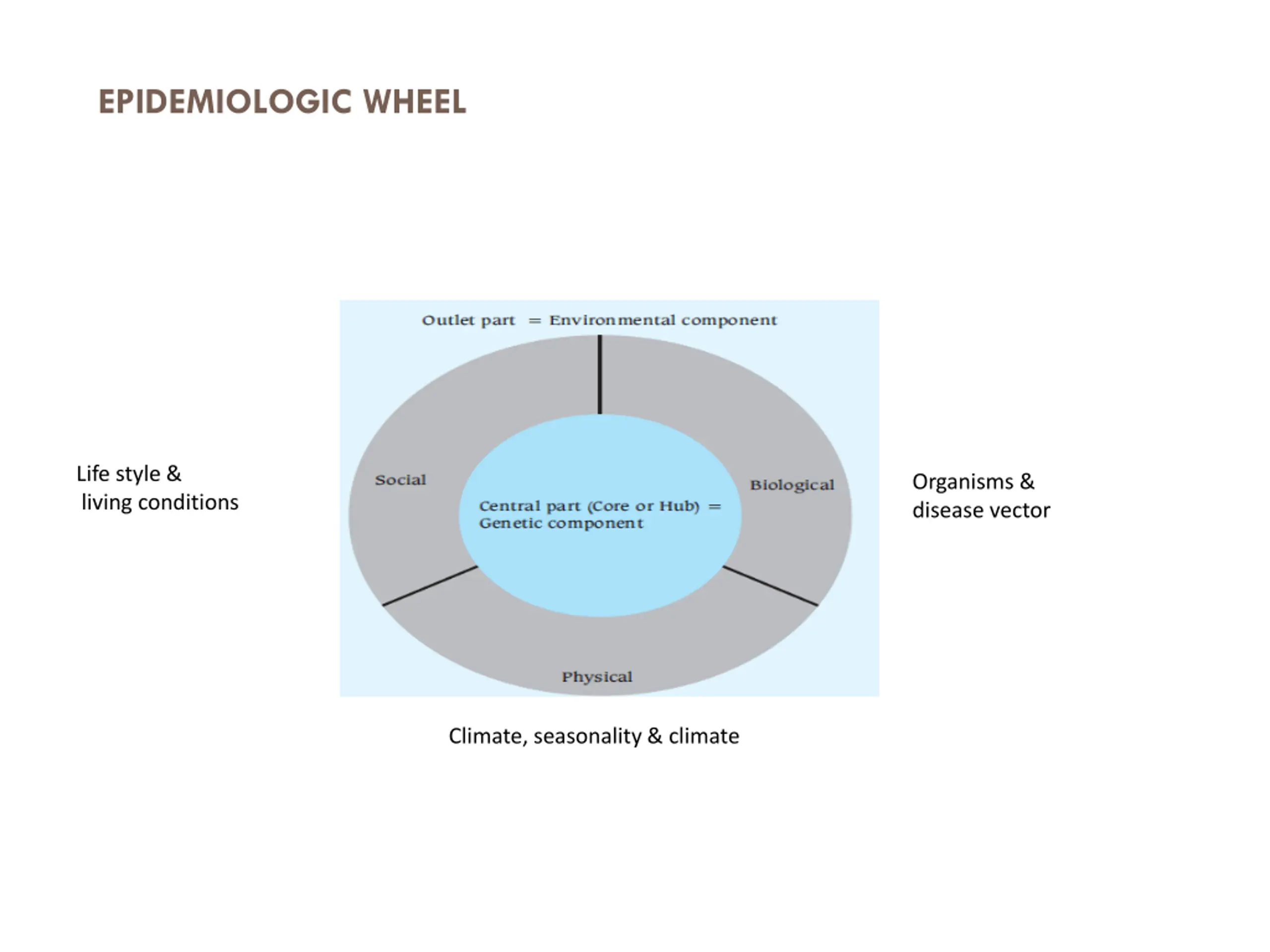 EPIDEMIOLOGIC WHEEL Life style & living conditions Organisms & disease vector Climate, seasonality & climate