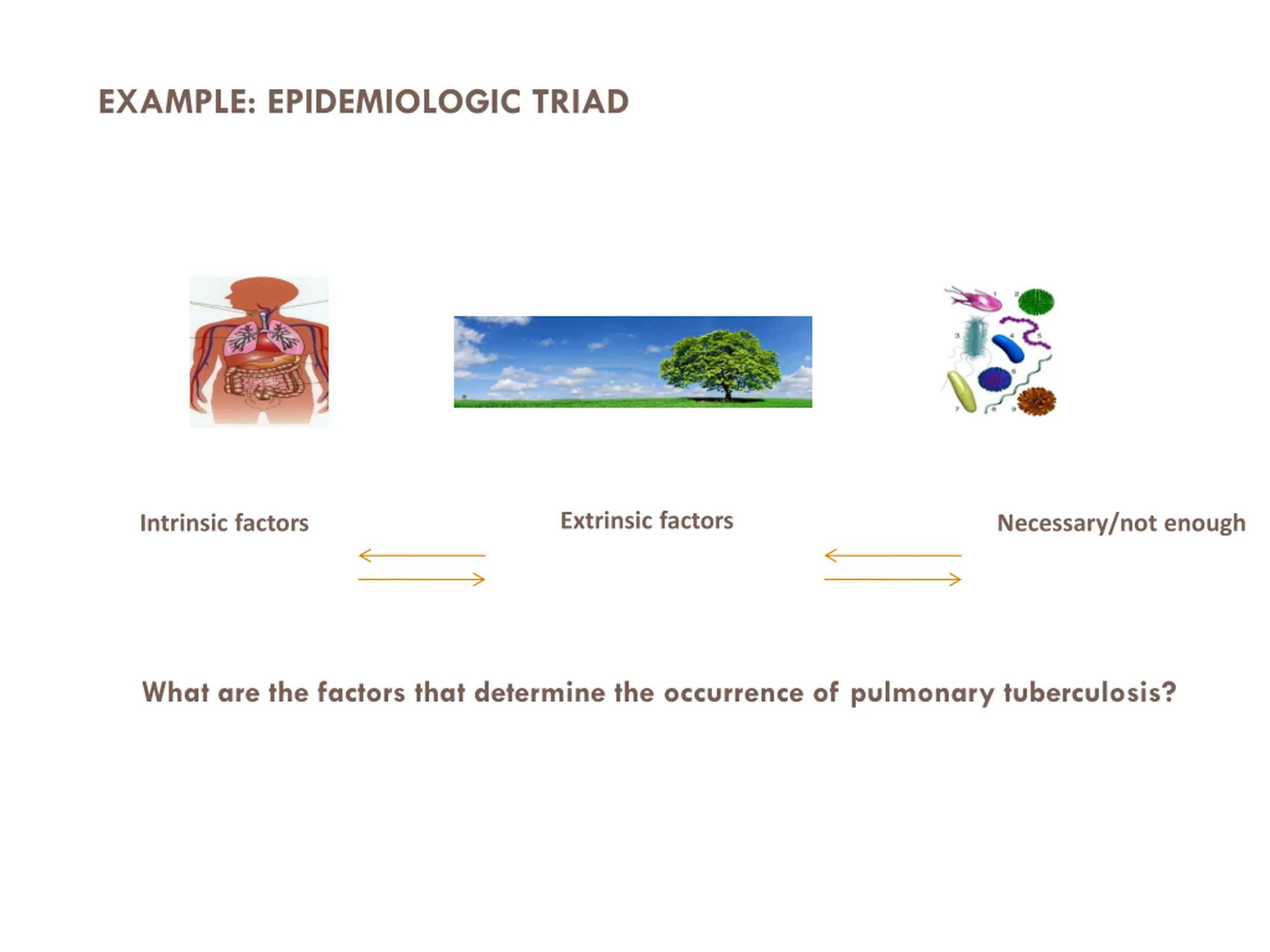 EXAMPLE: EPIDEMIOLOGIC TRIAD Extrinsic factors Intrinsic factors Necessary/not enough What are the factors that determine the occurrence of pulmonary tuberculosis?