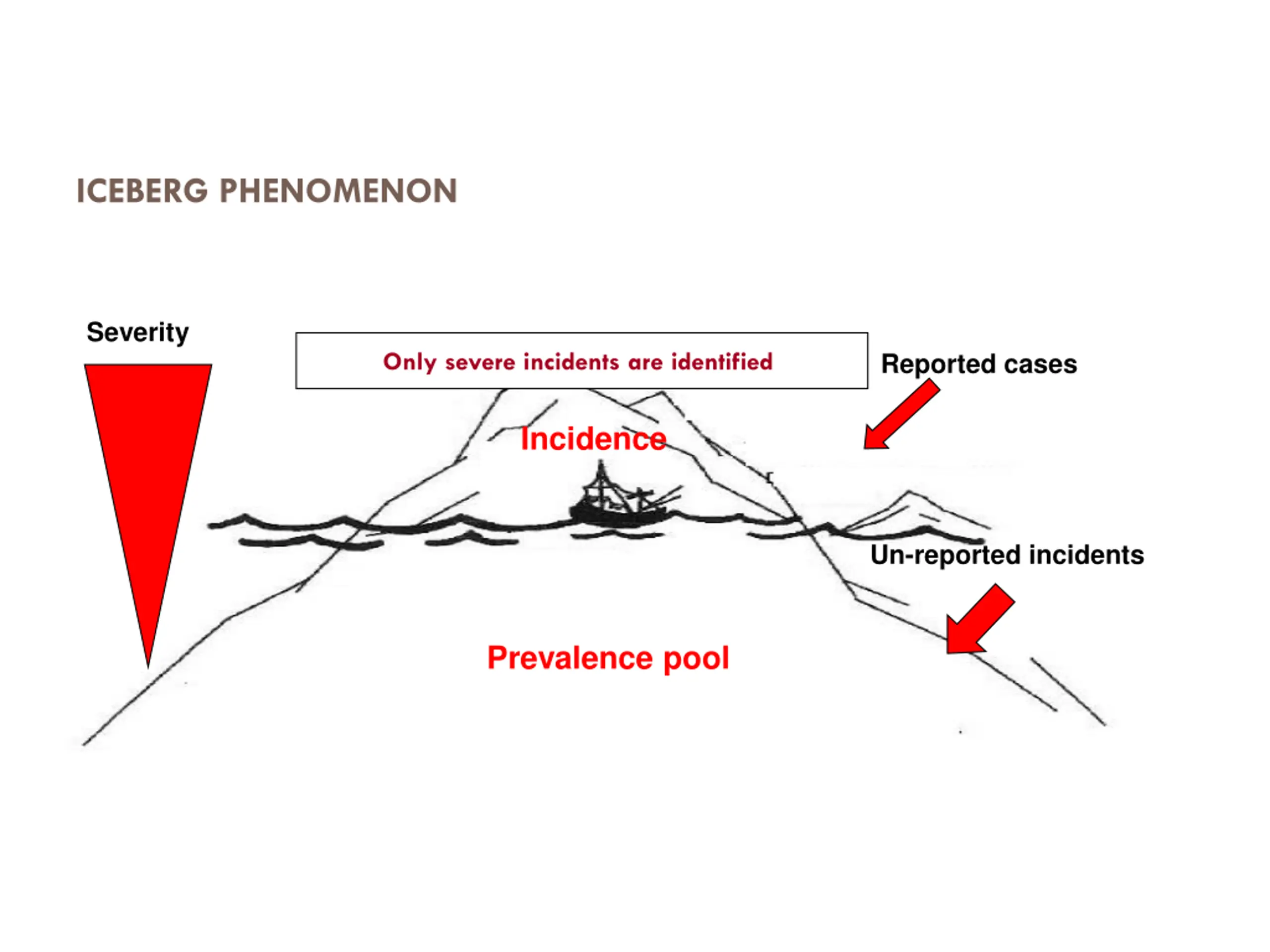 ICEBERG PHENOMENON Severity Only severe incidents are identified Reported cases Incidence Un-reported incidents Prevalence pool