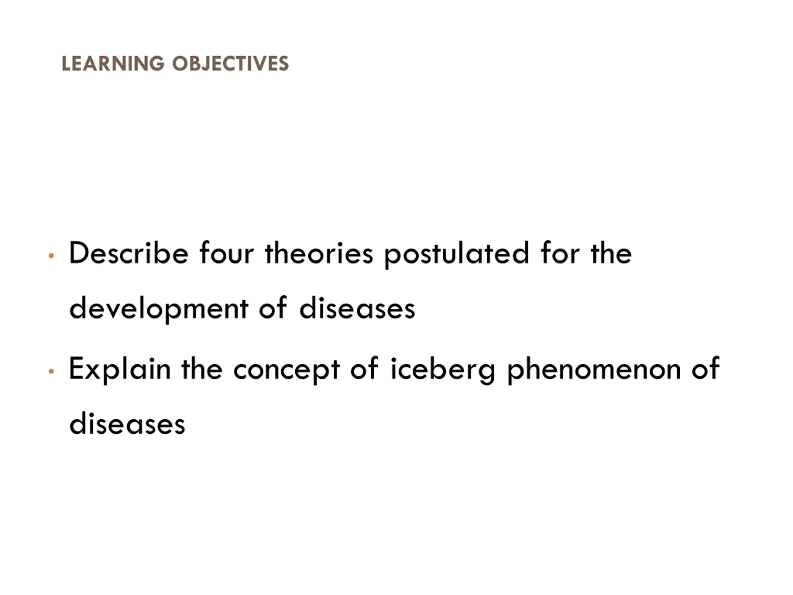 LEARNING OBJECTIVES Describe four theories postulated for the development of diseases Explain the concept of iceberg phenomenon of diseases
