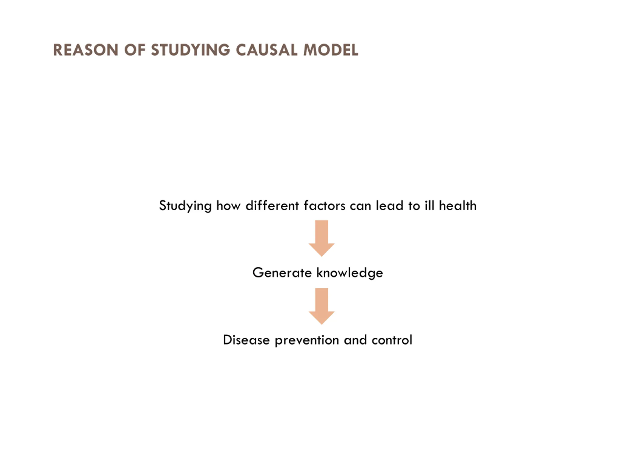 REASON OF STUDYING CAUSAL MODEL Studying how different factors can lead to ill health Generate knowledge Disease prevention and control