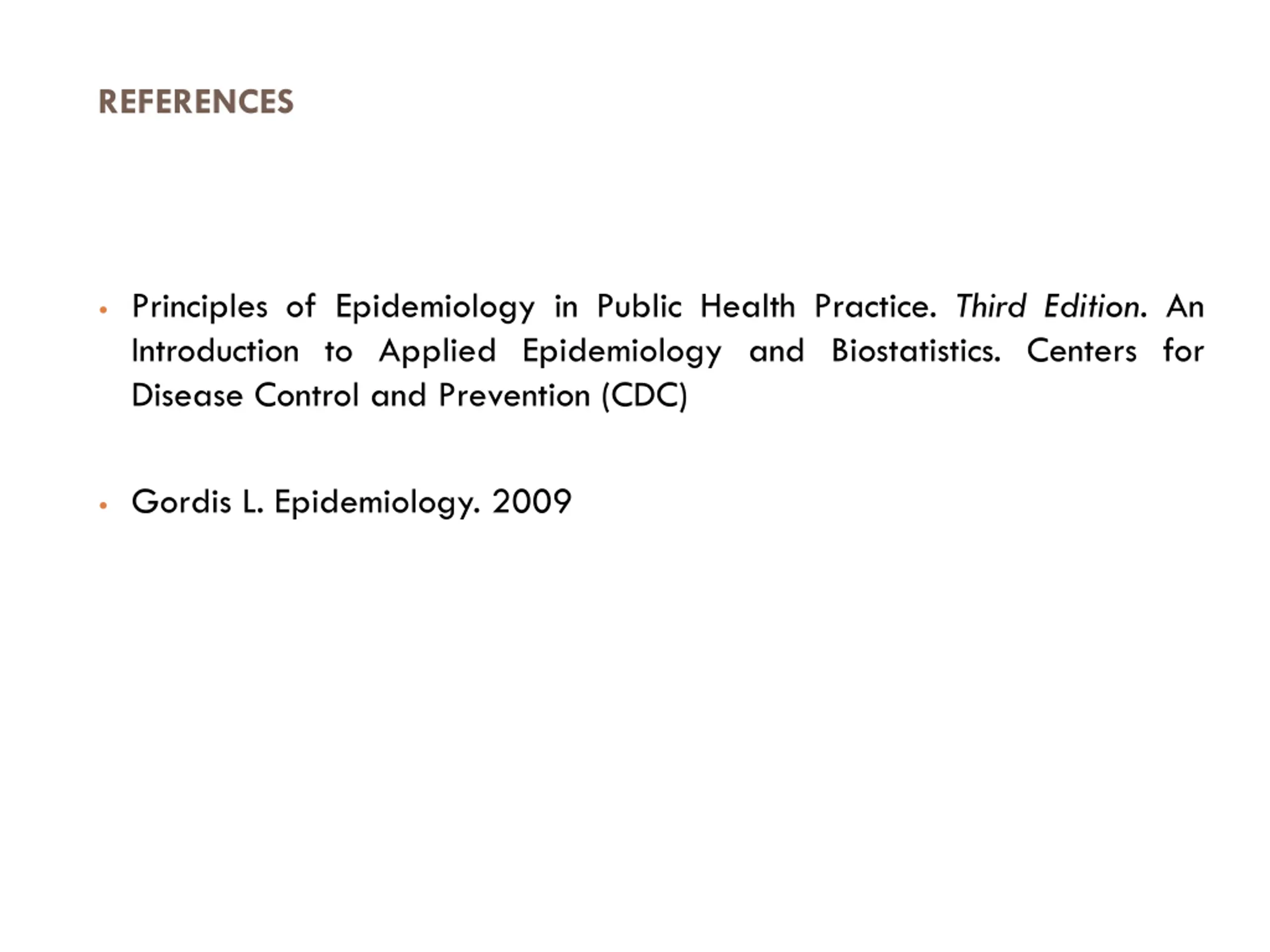 REFERENCES Principles of Epidemiology in Public Health Practice. Third Edition. An Introduction to Applied Epidemiology and Biostatistics. Centers for Disease Control and Prevention (CDC) Gordis L. Epidemiology. 2009