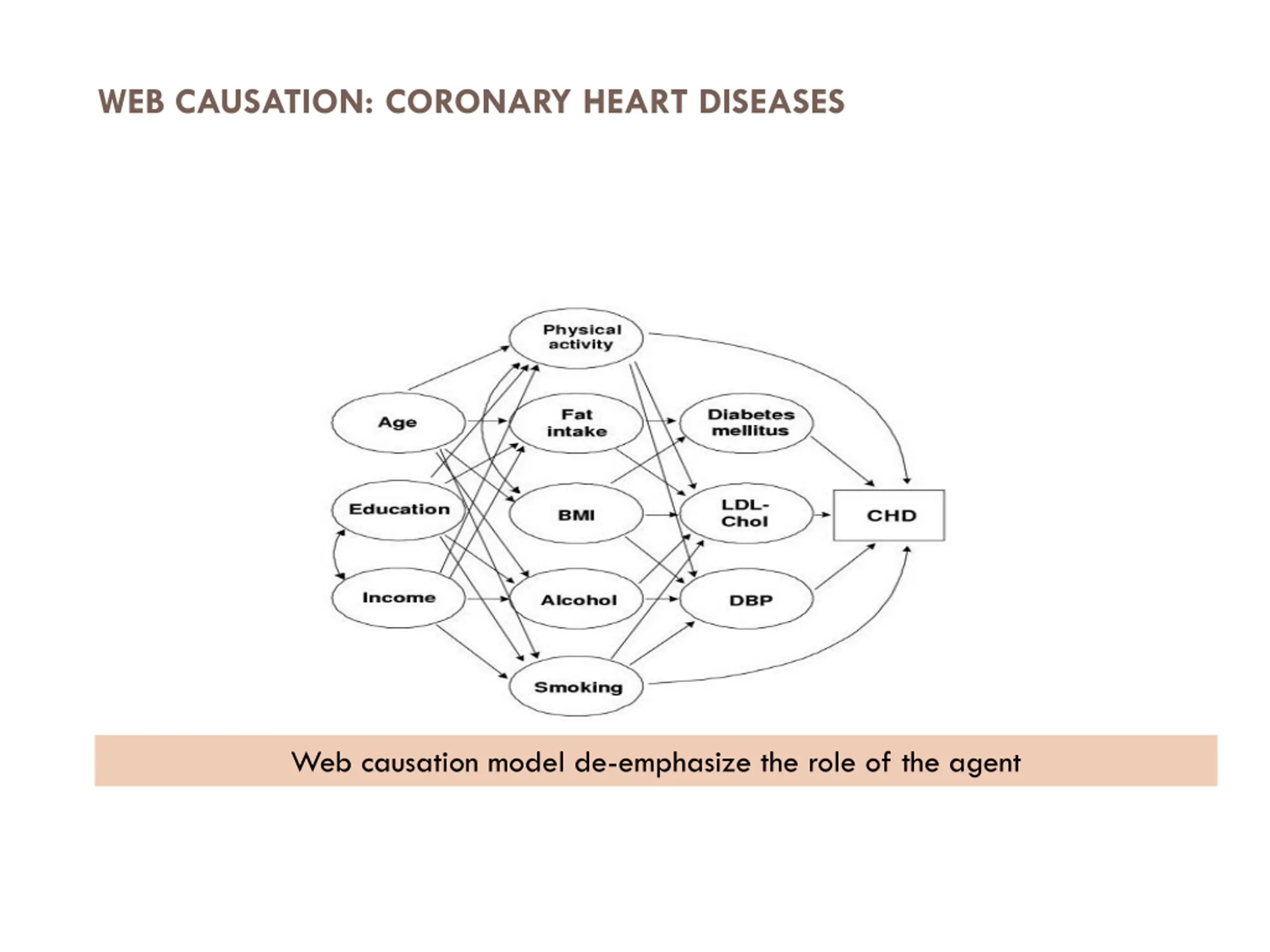 WEB CAUSATION: CORONARY HEART DISEASES Web causation model de-emphasize the role of the agent