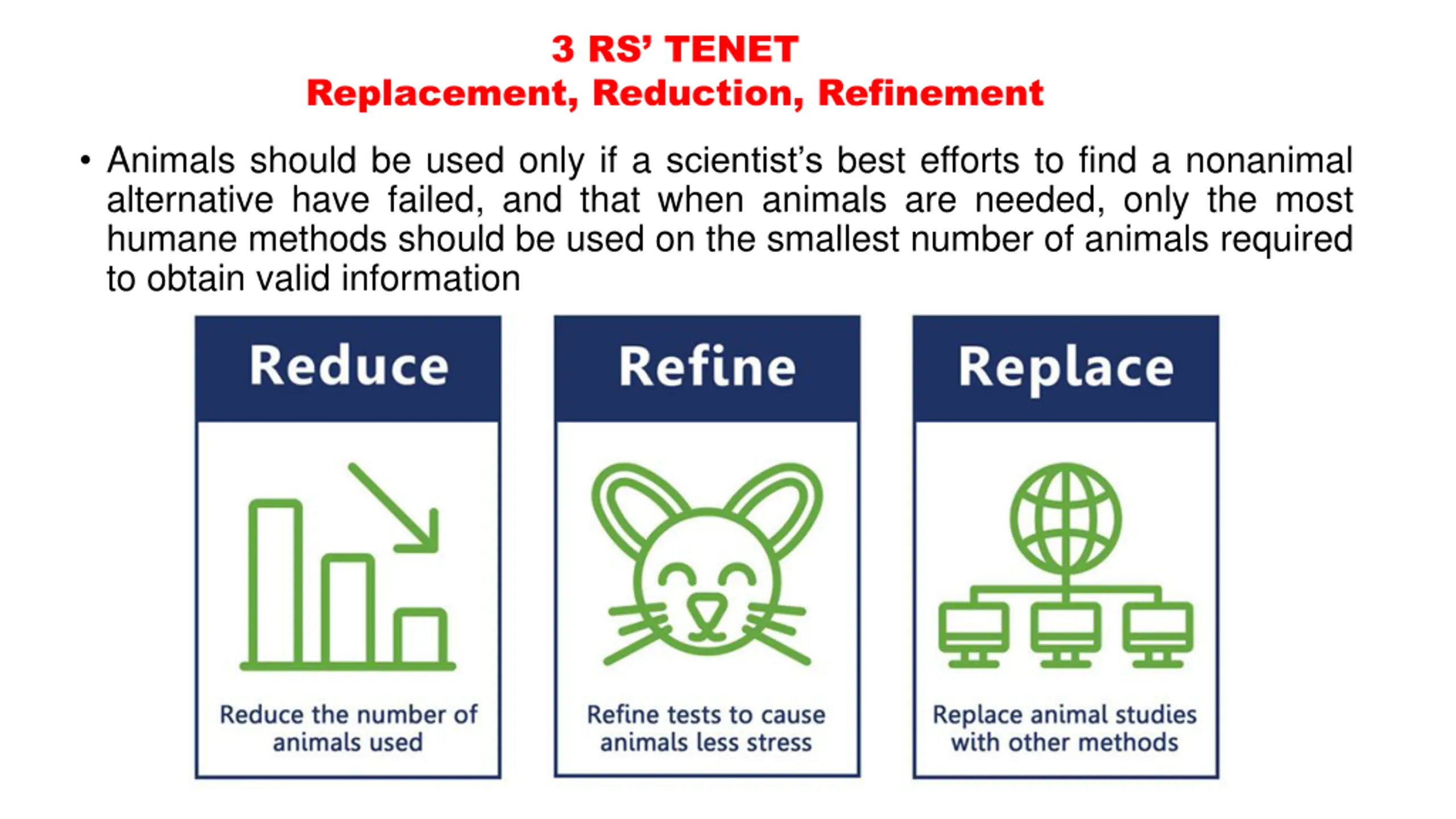 3 RS TENET Replacement, Reduction, Refinement Animals should be used only if a scientist s best efforts to find a nonanimal alternative have failed, and that when animals are needed, only the most humane methods should be used on the smallest number of animals required to obtain valid information