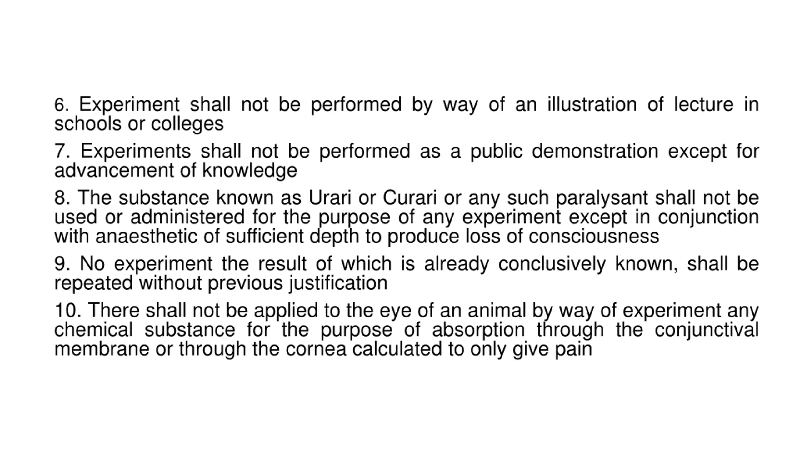 6. Experiment shall not be performed by way of an illustration of lecture in schools or colleges 7. Experiments shall not be performed as a public demonstration except for advancement of knowledge 8. The substance known as Urari or Curari or any such paralysant shall not be used or administered for the purpose of any experiment except in conjunction with anaesthetic of sufficient depth to produce loss of consciousness 9. No experiment the result of which is already conclusively known, shall be repeated without previous justification 10. There shall not be applied to the eye of an animal by way of experiment any chemical substance for the purpose of absorption through the conjunctival membrane or through the cornea calculated to only give pain