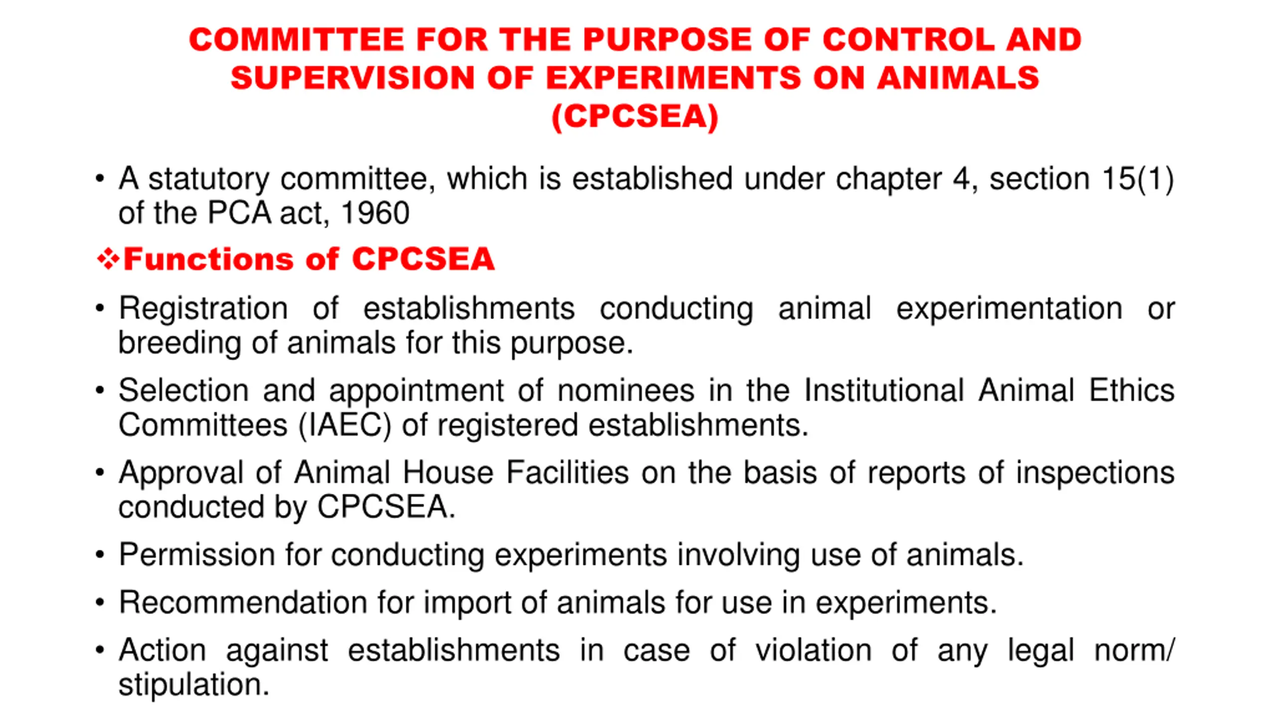 COMMITTEE FOR THE PURPOSE OF CONTROL AND SUPERVISION OF EXPERIMENTS ON ANIMALS (CPCSEA) A statutory committee, which is established under chapter 4, section 15(1) of the PCA act, 1960 Functions of CPCSEA Registration of establishments conducting animal experimentation or breeding of animals for this purpose. Selection and appointment of nominees in the Institutional Animal Ethics Committees (IAEC) of registered establishments. Approval of Animal House Facilities on the basis of reports of inspections conducted by CPCSEA. Permission for conducting experiments involving use of animals. Recommendation for import of animals for use in experiments. Action against establishments in case of violation of any legal norm/ stipulation.