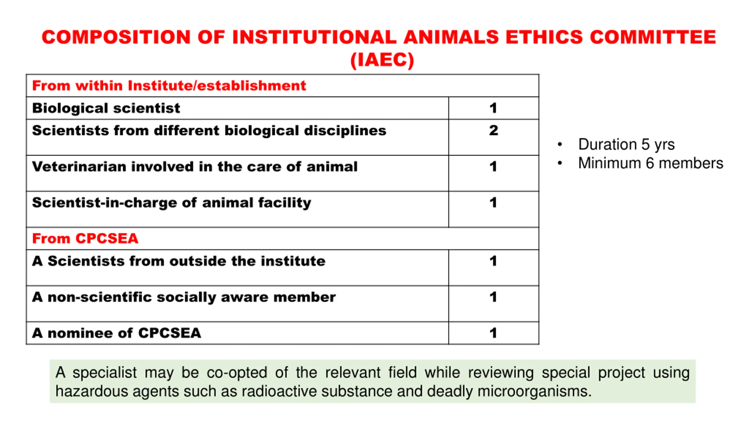 COMPOSITION OF INSTITUTIONAL ANIMALS ETHICS COMMITTEE (IAEC) From within Institute/establishment Biological scientist Scientists from different biological disciplines 1 2 Duration 5 yrs Minimum 6 members Veterinarian involved in the care of animal 1 Scientist-in-charge of animal facility 1 From CPCSEA A Scientists from outside the institute 1 A non-scientific socially aware member 1 A nominee of CPCSEA 1 A specialist may be co-opted of the relevant field while reviewing special project using hazardous agents such as radioactive substance and deadly microorganisms.
