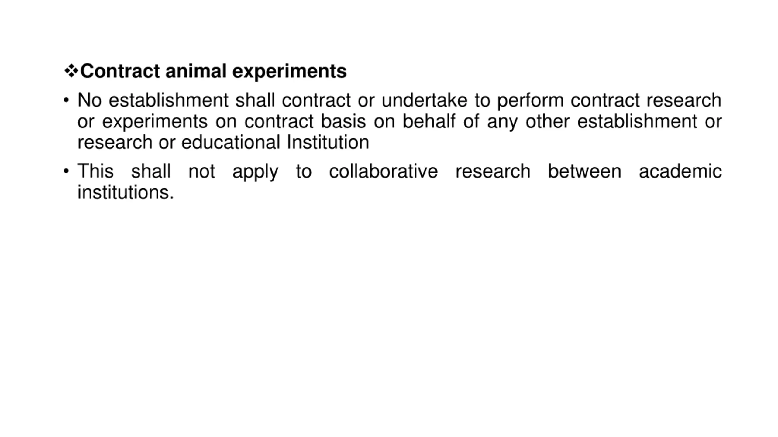 Contract animal experiments No establishment shall contract or undertake to perform contract research or experiments on contract basis on behalf of any other establishment or research or educational Institution This shall not apply to collaborative research between academic institutions.