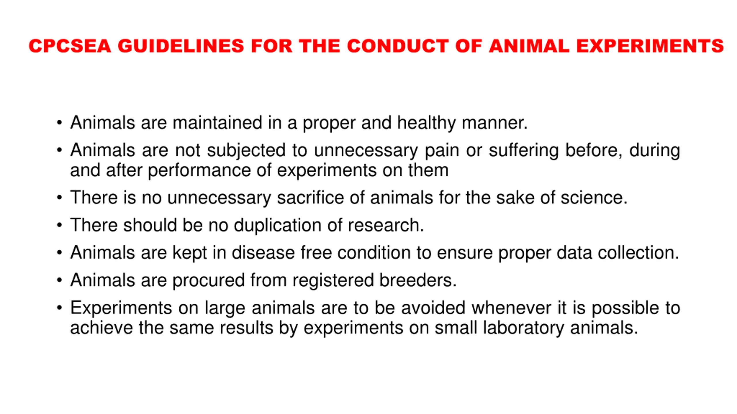 CPCSEA GUIDELINES FOR THE CONDUCT OF ANIMAL EXPERIMENTS Animals are maintained in a proper and healthy manner. Animals are not subjected to unnecessary pain or suffering before, during and after performance of experiments on them There is no unnecessary sacrifice of animals for the sake of science. There should be no duplication of research. Animals are kept in disease free condition to ensure proper data collection. Animals are procured from registered breeders. Experiments on large animals are to be avoided whenever it is possible to achieve the same results by experiments on small laboratory animals.