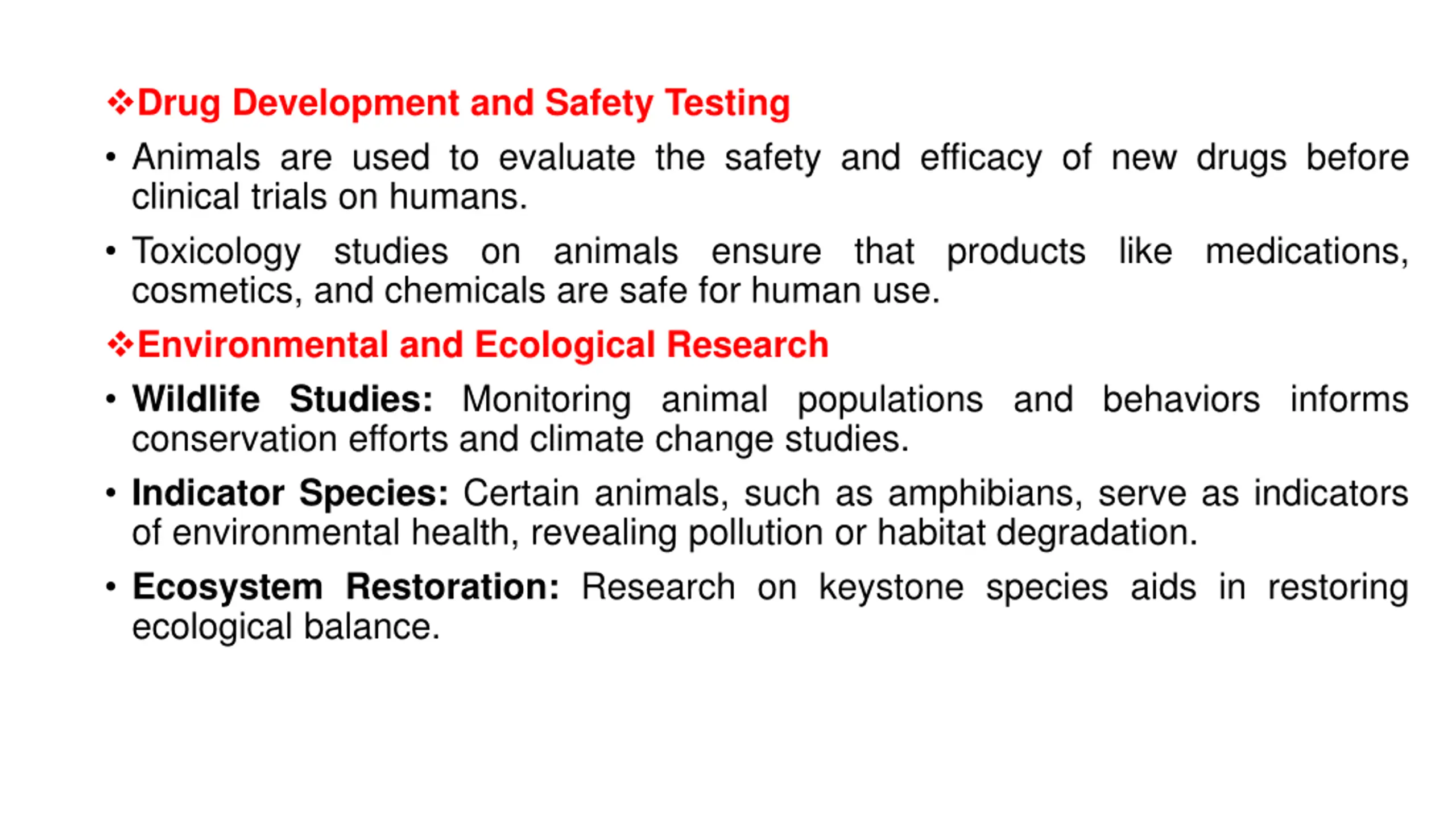 Drug Development and Safety Testing Animals are used to evaluate the safety and efficacy of new drugs before clinical trials on humans. Toxicology studies on animals ensure that products like medications, cosmetics, and chemicals are safe for human use. Environmental and Ecological Research Wildlife Studies: Monitoring animal populations and behaviors informs conservation efforts and climate change studies. Indicator Species: Certain animals, such as amphibians, serve as indicators of environmental health, revealing pollution or habitat degradation. Ecosystem Restoration: Research on keystone species aids in restoring ecological balance.