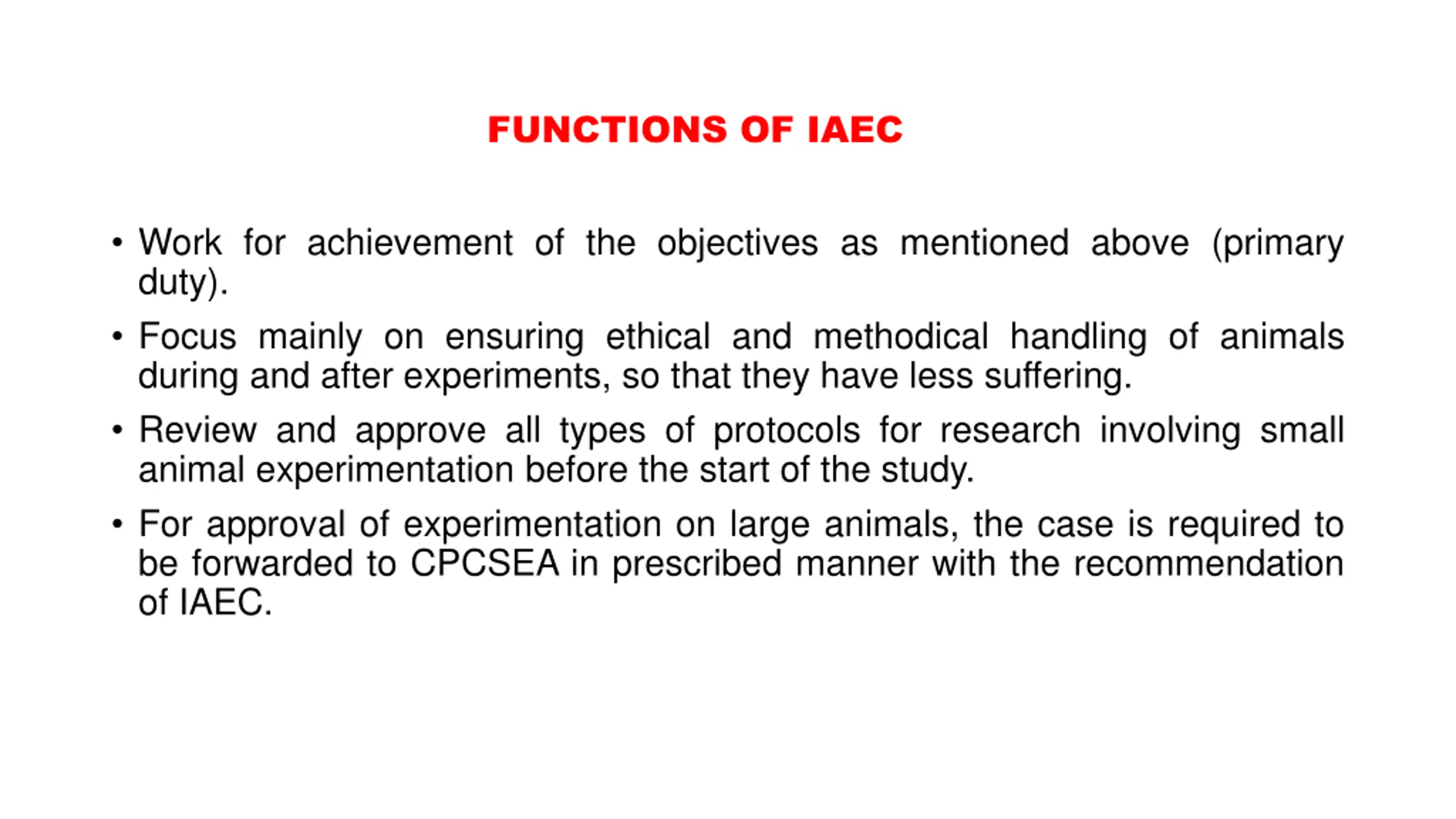 FUNCTIONS OF IAEC Work for achievement of the objectives as mentioned above (primary duty). Focus mainly on ensuring ethical and methodical handling of animals during and after experiments, so that they have less suffering. Review and approve all types of protocols for research involving small animal experimentation before the start of the study. For approval of experimentation on large animals, the case is required to be forwarded to CPCSEA in prescribed manner with the recommendation of IAEC.