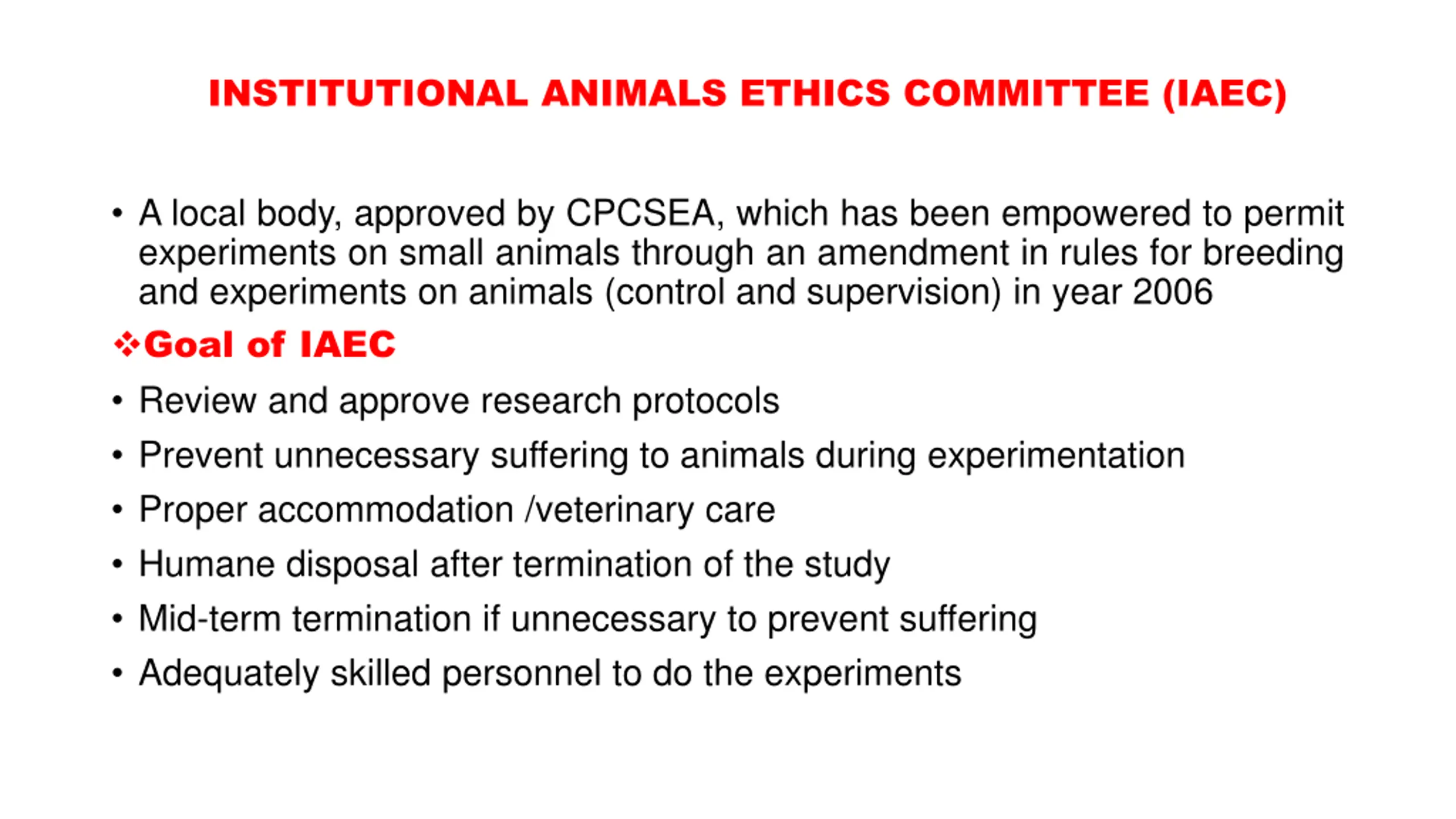 INSTITUTIONAL ANIMALS ETHICS COMMITTEE (IAEC) A local body, approved by CPCSEA, which has been empowered to permit experiments on small animals through an amendment in rules for breeding and experiments on animals (control and supervision) in year 2006 Goal of IAEC Review and approve research protocols Prevent unnecessary suffering to animals during experimentation Proper accommodation /veterinary care Humane disposal after termination of the study Mid-term termination if unnecessary to prevent suffering Adequately skilled personnel to do the experiments