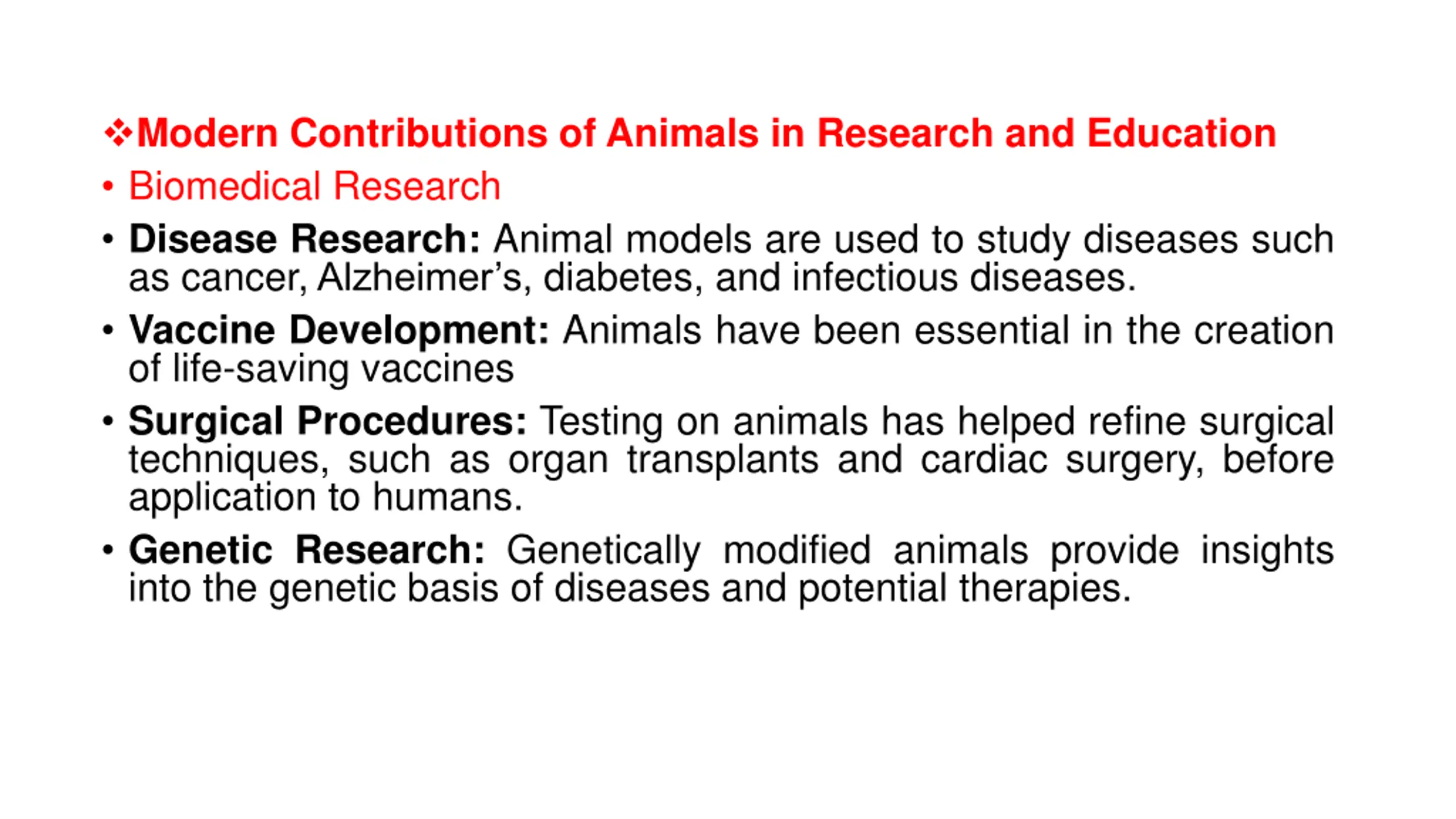 Modern Contributions of Animals in Research and Education Biomedical Research Disease Research: Animal models are used to study diseases such as cancer, Alzheimer s, diabetes, and infectious diseases. Vaccine Development: Animals have been essential in the creation of life-saving vaccines Surgical Procedures: Testing on animals has helped refine surgical techniques, such as organ transplants and cardiac surgery, before application to humans. Genetic Research: Genetically modified animals provide insights into the genetic basis of diseases and potential therapies.