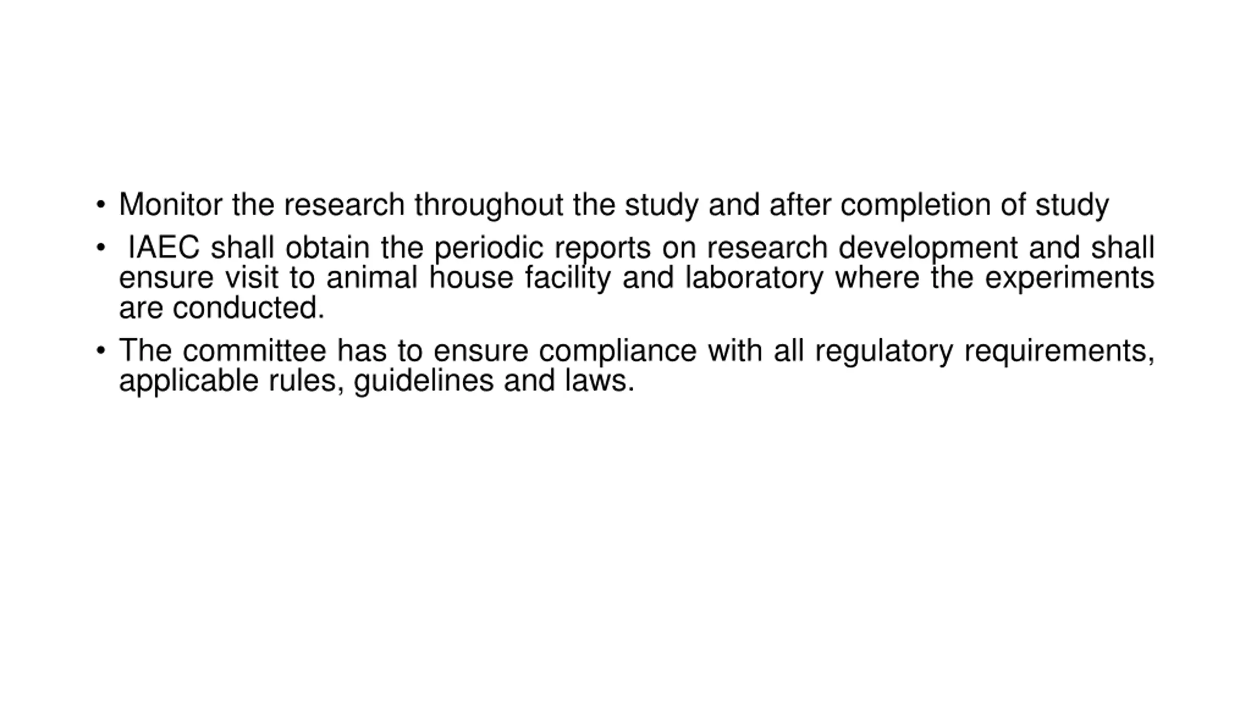 Monitor the research throughout the study and after completion of study IAEC shall obtain the periodic reports on research development and shall ensure visit to animal house facility and laboratory where the experiments are conducted. The committee has to ensure compliance with all regulatory requirements, applicable rules, guidelines and laws.