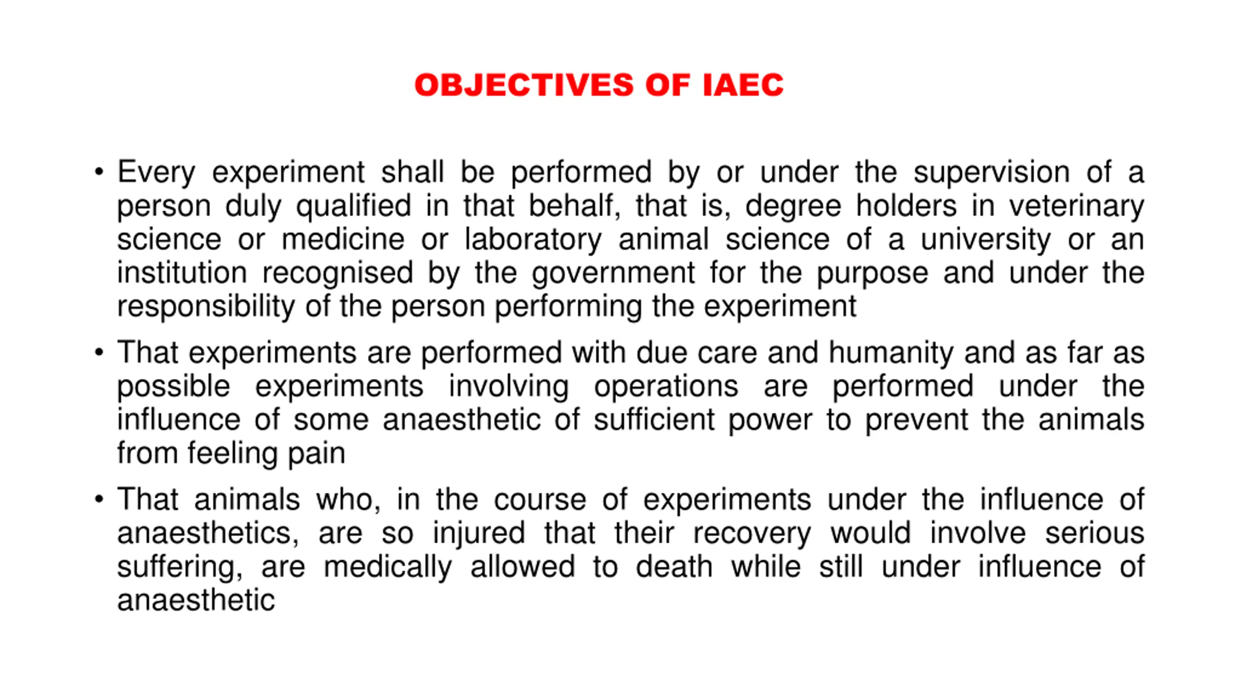OBJECTIVES OF IAEC Every experiment shall be performed by or under the supervision of a person duly qualified in that behalf, that is, degree holders in veterinary science or medicine or laboratory animal science of a university or an institution recognised by the government for the purpose and under the responsibility of the person performing the experiment That experiments are performed with due care and humanity and as far as possible experiments involving operations are performed under the influence of some anaesthetic of sufficient power to prevent the animals from feeling pain That animals who, in the course of experiments under the influence of anaesthetics, are so injured that their recovery would involve serious suffering, are medically allowed to death while still under influence of anaesthetic