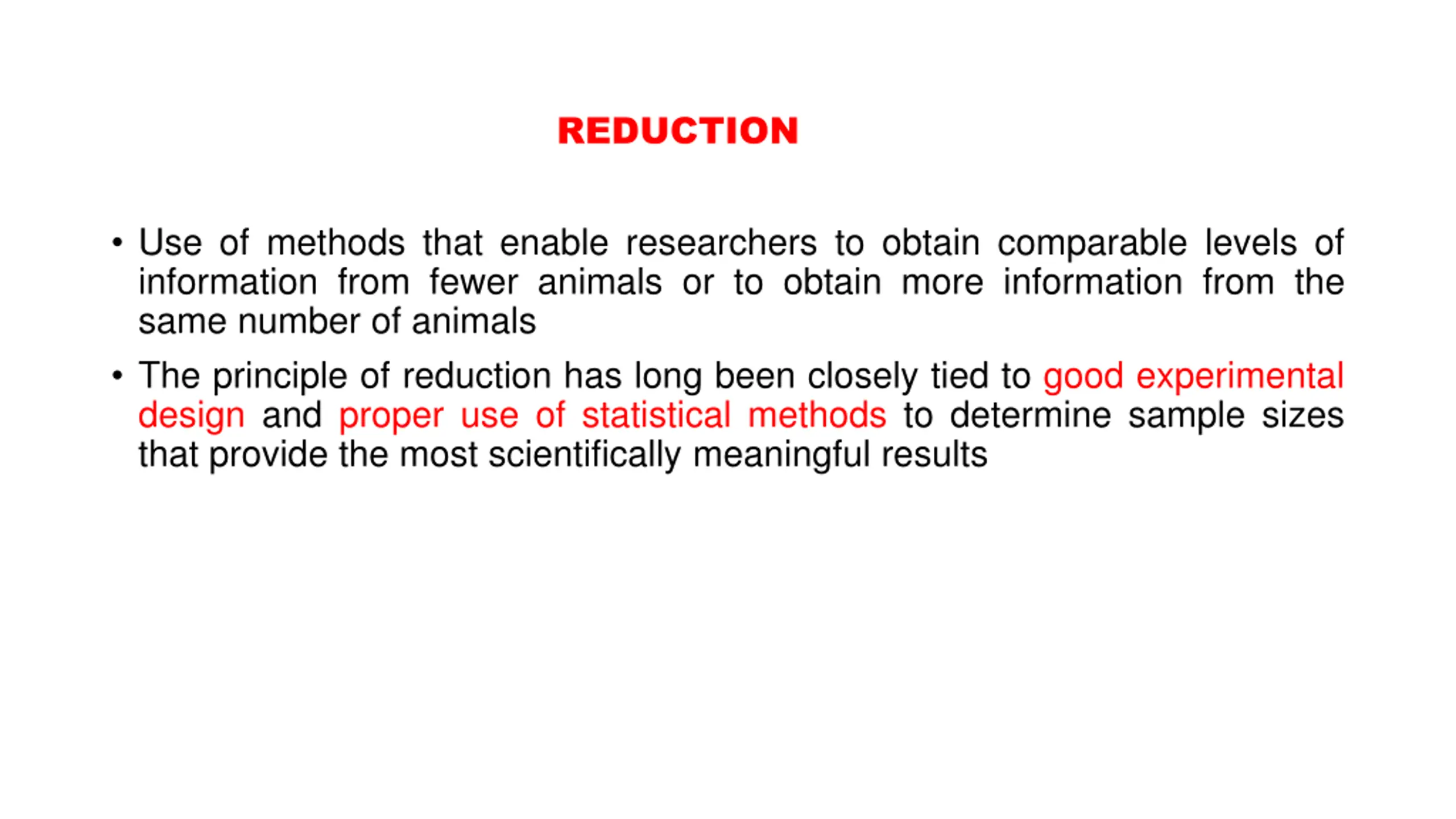 REDUCTION Use of methods that enable researchers to obtain comparable levels of information from fewer animals or to obtain more information from the same number of animals The principle of reduction has long been closely tied to good experimental design and proper use of statistical methods to determine sample sizes that provide the most scientifically meaningful results
