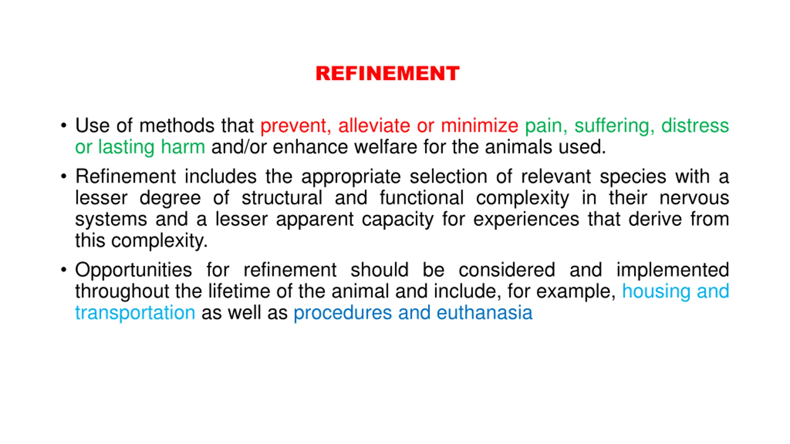 REFINEMENT Use of methods that prevent, alleviate or minimize pain, suffering, distress or lasting harm and/or enhance welfare for the animals used. Refinement includes the appropriate selection of relevant species with a lesser degree of structural and functional complexity in their nervous systems and a lesser apparent capacity for experiences that derive from this complexity. Opportunities for refinement should be considered and implemented throughout the lifetime of the animal and include, for example, housing and transportation as well as procedures and euthanasia