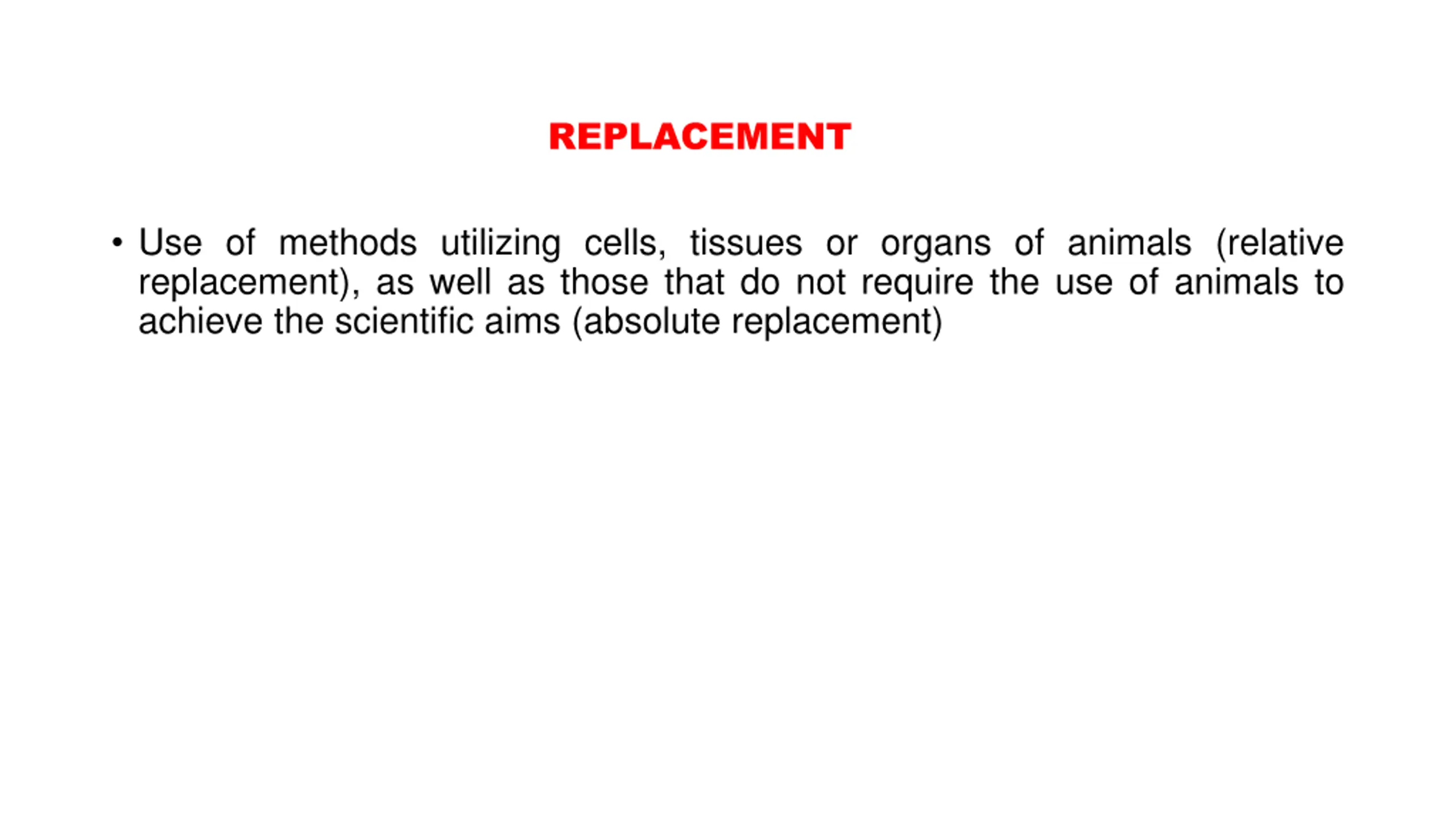 REPLACEMENT Use of methods utilizing cells, tissues or organs of animals (relative replacement), as well as those that do not require the use of animals to achieve the scientific aims (absolute replacement)