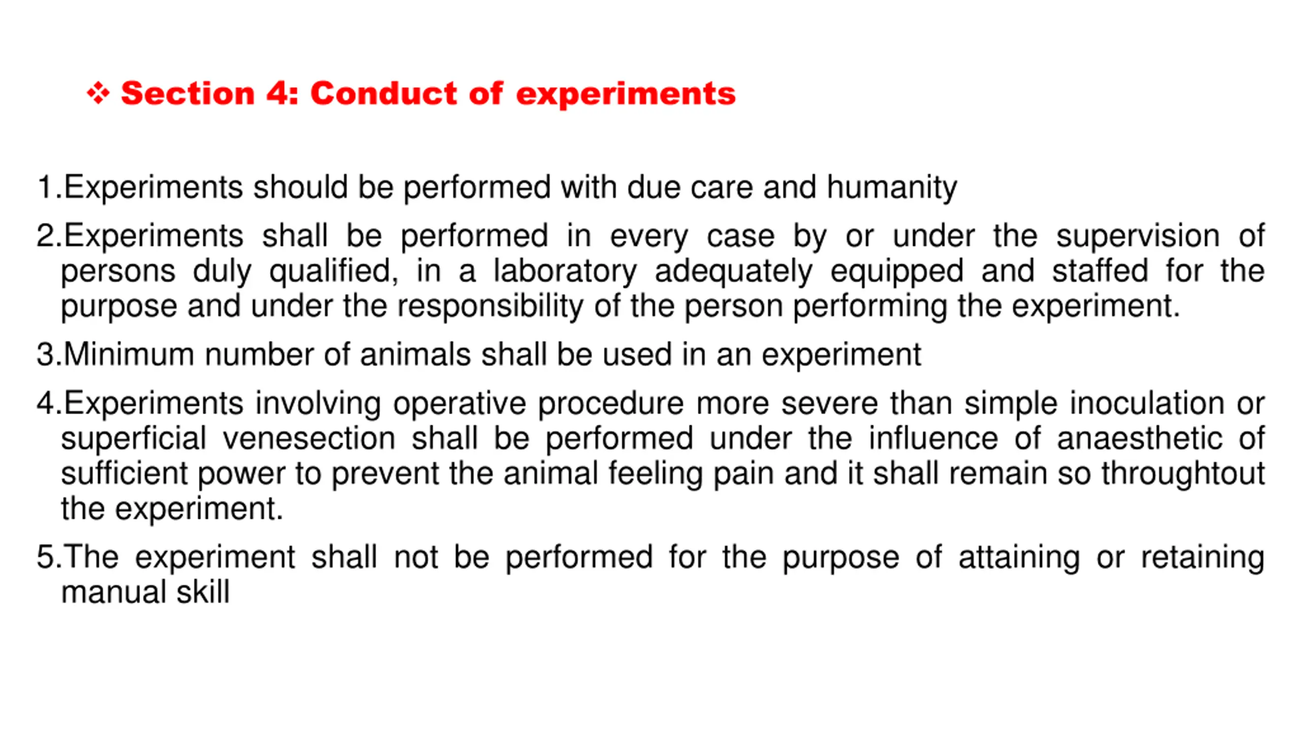 Section 4: Conduct of experiments 1.Experiments should be performed with due care and humanity 2.Experiments shall be performed in every case by or under the supervision of persons duly qualified, in a laboratory adequately equipped and staffed for the purpose and under the responsibility of the person performing the experiment. 3.Minimum number of animals shall be used in an experiment 4.Experiments involving operative procedure more severe than simple inoculation or superficial venesection shall be performed under the influence of anaesthetic of sufficient power to prevent the animal feeling pain and it shall remain so throughtout the experiment. 5.The experiment shall not be performed for the purpose of attaining or retaining manual skill