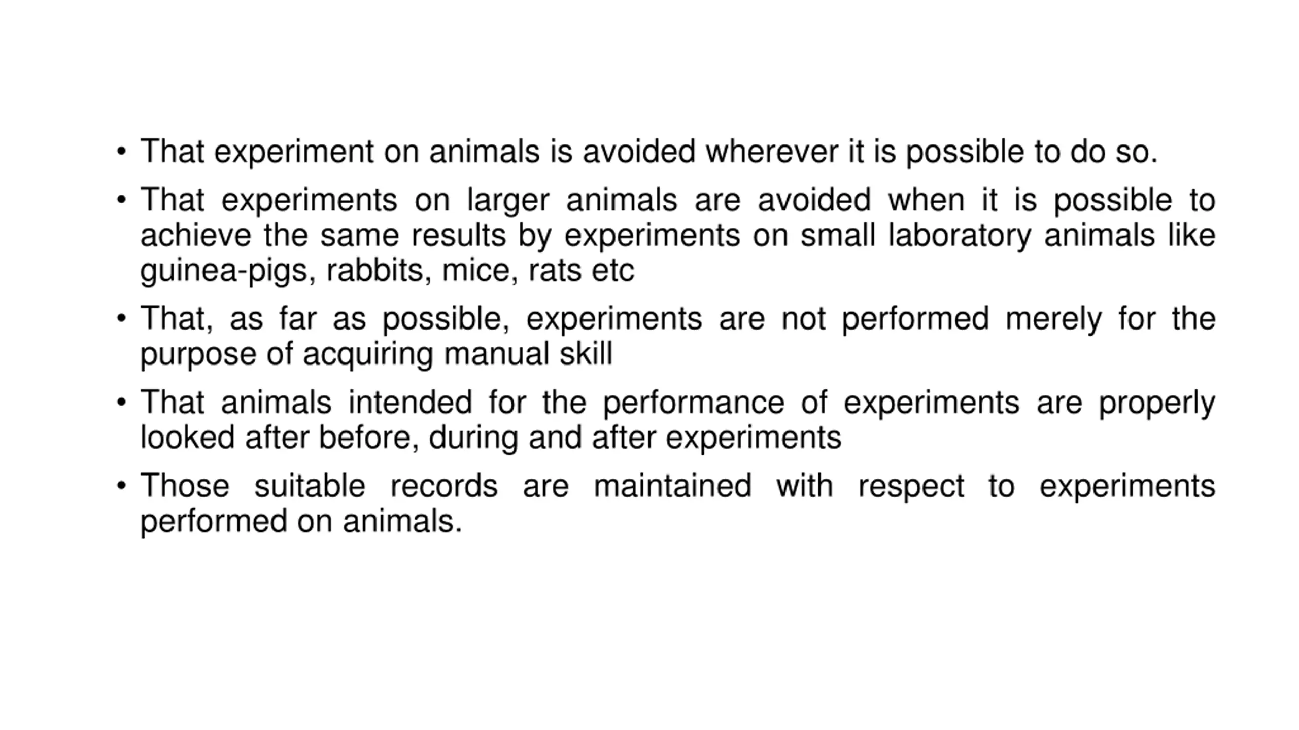 That experiment on animals is avoided wherever it is possible to do so. That experiments on larger animals are avoided when it is possible to achieve the same results by experiments on small laboratory animals like guinea-pigs, rabbits, mice, rats etc That, as far as possible, experiments are not performed merely for the purpose of acquiring manual skill That animals intended for the performance of experiments are properly looked after before, during and after experiments Those suitable records are maintained with respect to experiments performed on animals.