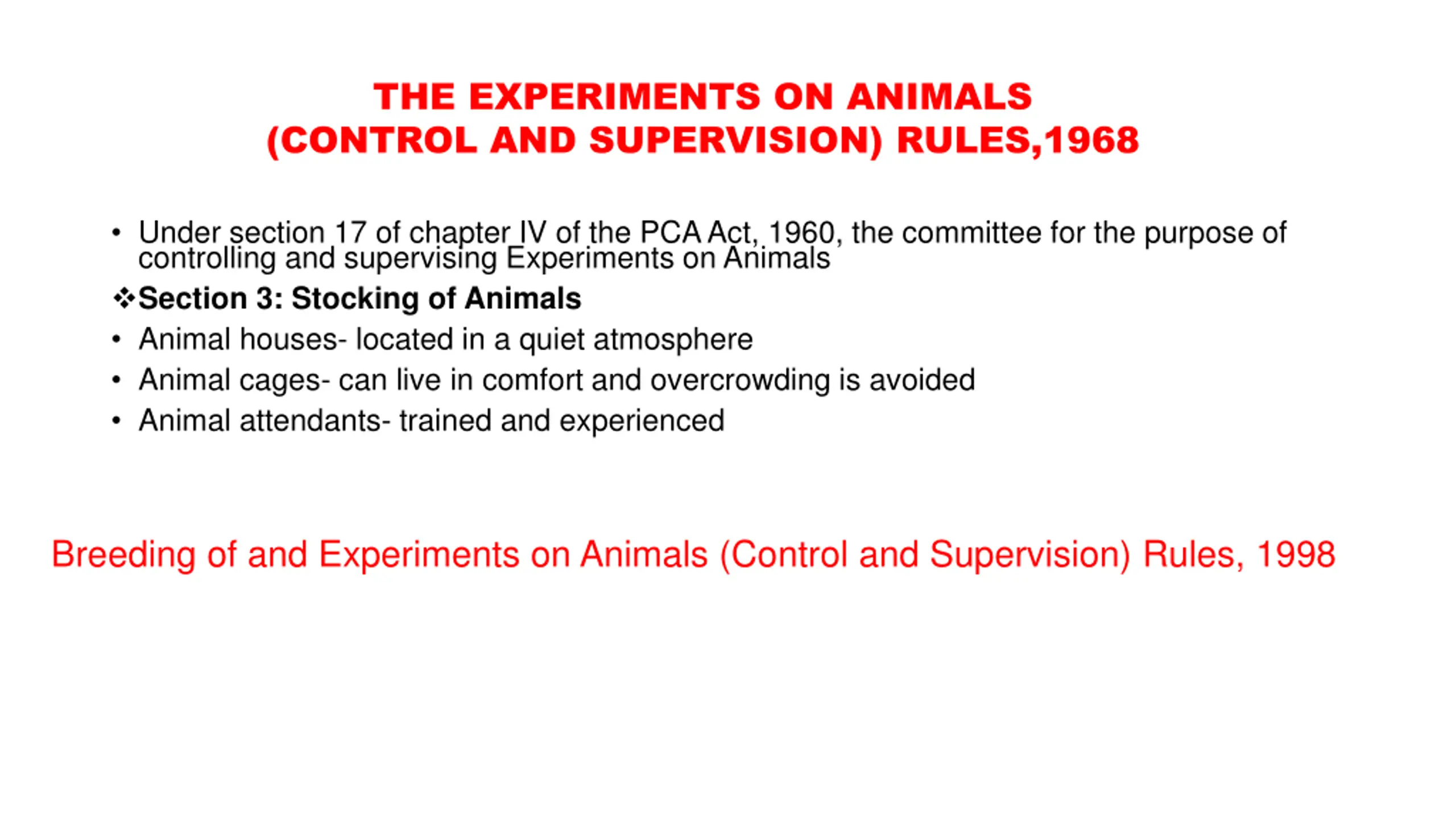 THE EXPERIMENTS ON ANIMALS (CONTROL AND SUPERVISION) RULES,1968 Under section 17 of chapter IV of the PCA Act, 1960, the committee for the purpose of controlling and supervising Experiments on Animals Section 3: Stocking of Animals Animal houses- located in a quiet atmosphere Animal cages- can live in comfort and overcrowding is avoided Animal attendants- trained and experienced Breeding of and Experiments on Animals (Control and Supervision) Rules, 1998