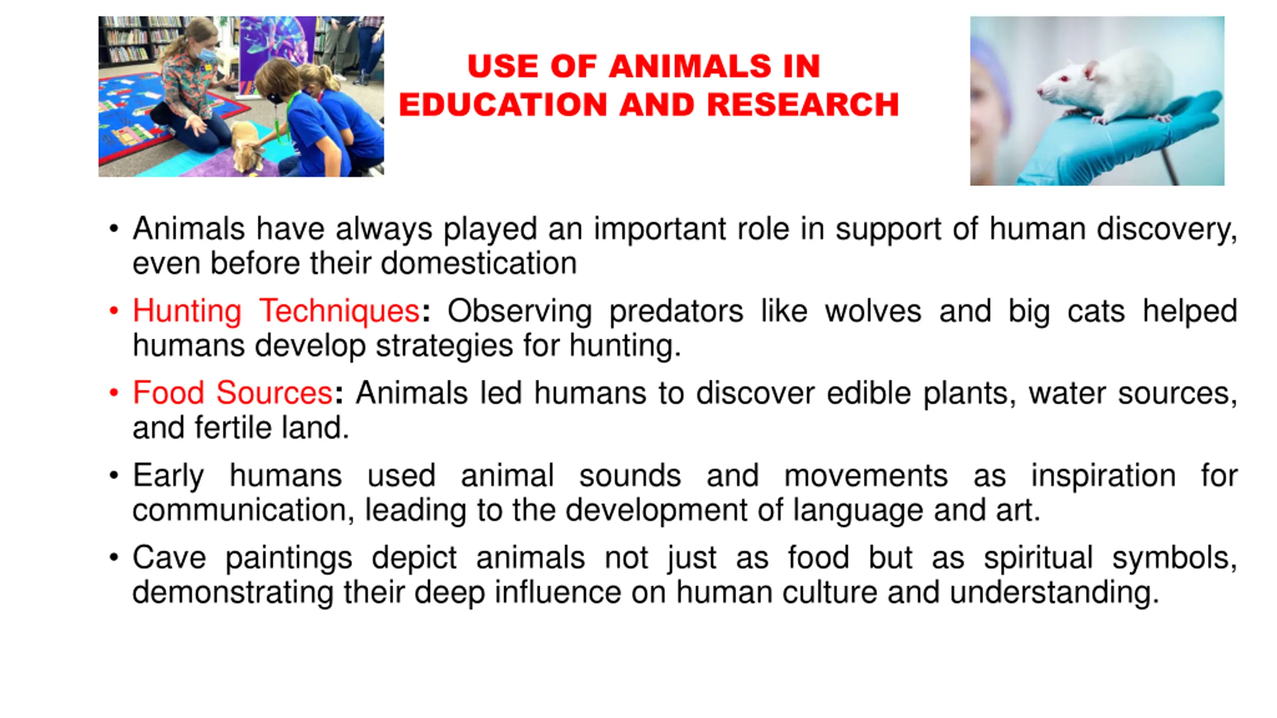 USE OF ANIMALS IN EDUCATION AND RESEARCH Animals have always played an important role in support of human discovery, even before their domestication Hunting Techniques: Observing predators like wolves and big cats helped humans develop strategies for hunting. Food Sources: Animals led humans to discover edible plants, water sources, and fertile land. Early humans used animal sounds and movements as inspiration for communication, leading to the development of language and art. Cave paintings depict animals not just as food but as spiritual symbols, demonstrating their deep influence on human culture and understanding.
