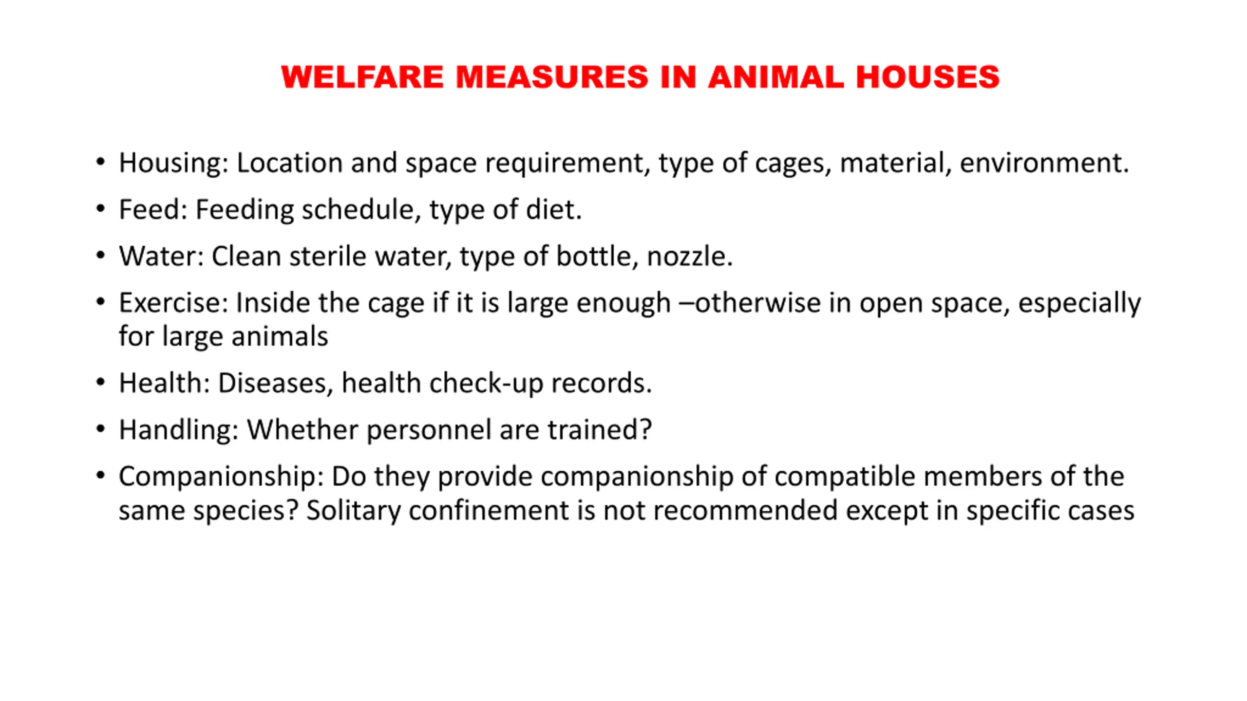 WELFARE MEASURES IN ANIMAL HOUSES Housing: Location and space requirement, type of cages, material, environment. Feed: Feeding schedule, type of diet. Water: Clean sterile water, type of bottle, nozzle. Exercise: Inside the cage if it is large enough otherwise in open space, especially for large animals Health: Diseases, health check-up records. Handling: Whether personnel are trained? Companionship: Do they provide companionship of compatible members of the same species? Solitary confinement is not recommended except in specific cases