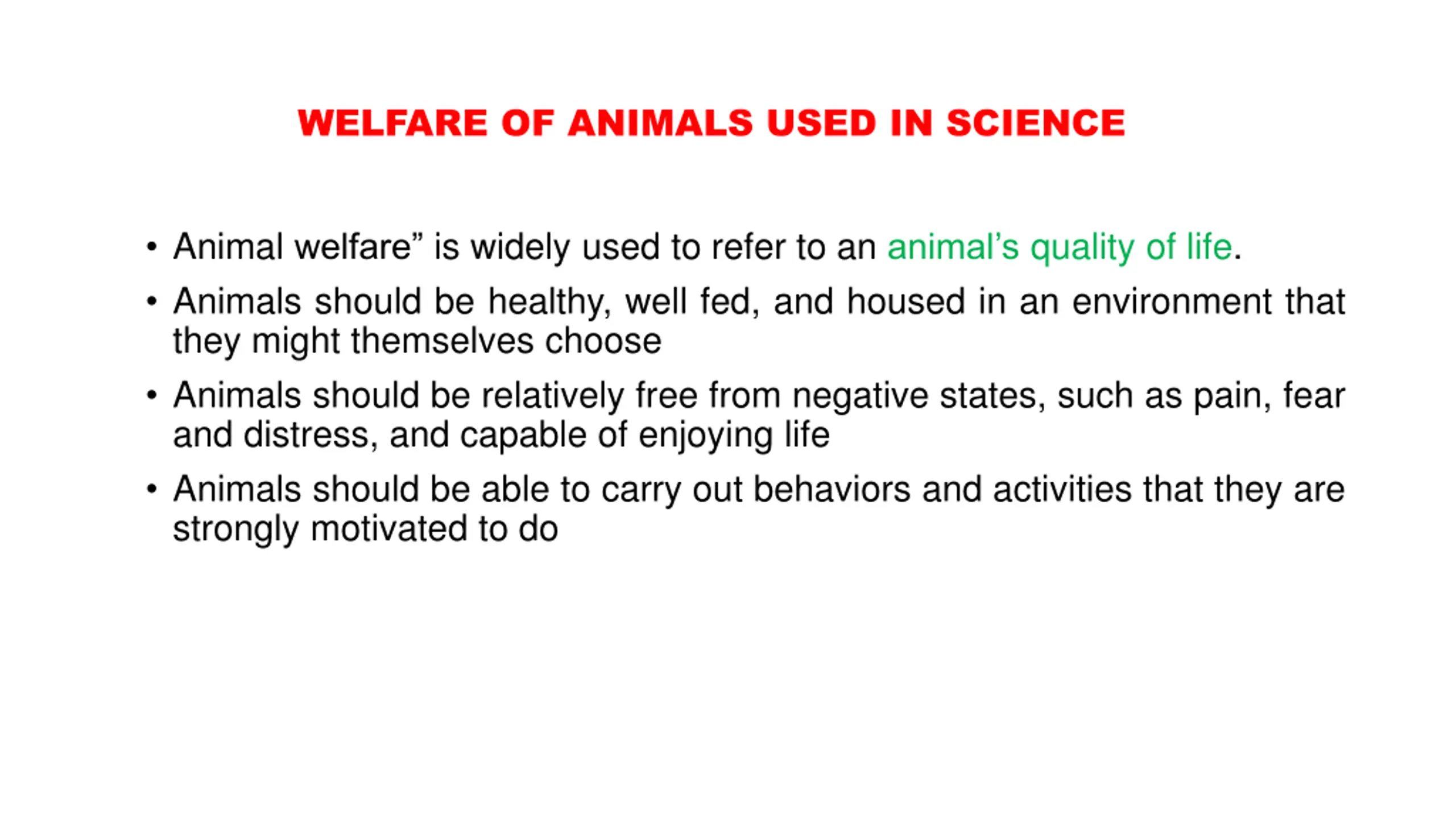 WELFARE OF ANIMALS USED IN SCIENCE Animal welfare is widely used to refer to an animal s quality of life. Animals should be healthy, well fed, and housed in an environment that they might themselves choose Animals should be relatively free from negative states, such as pain, fear and distress, and capable of enjoying life Animals should be able to carry out behaviors and activities that they are strongly motivated to do