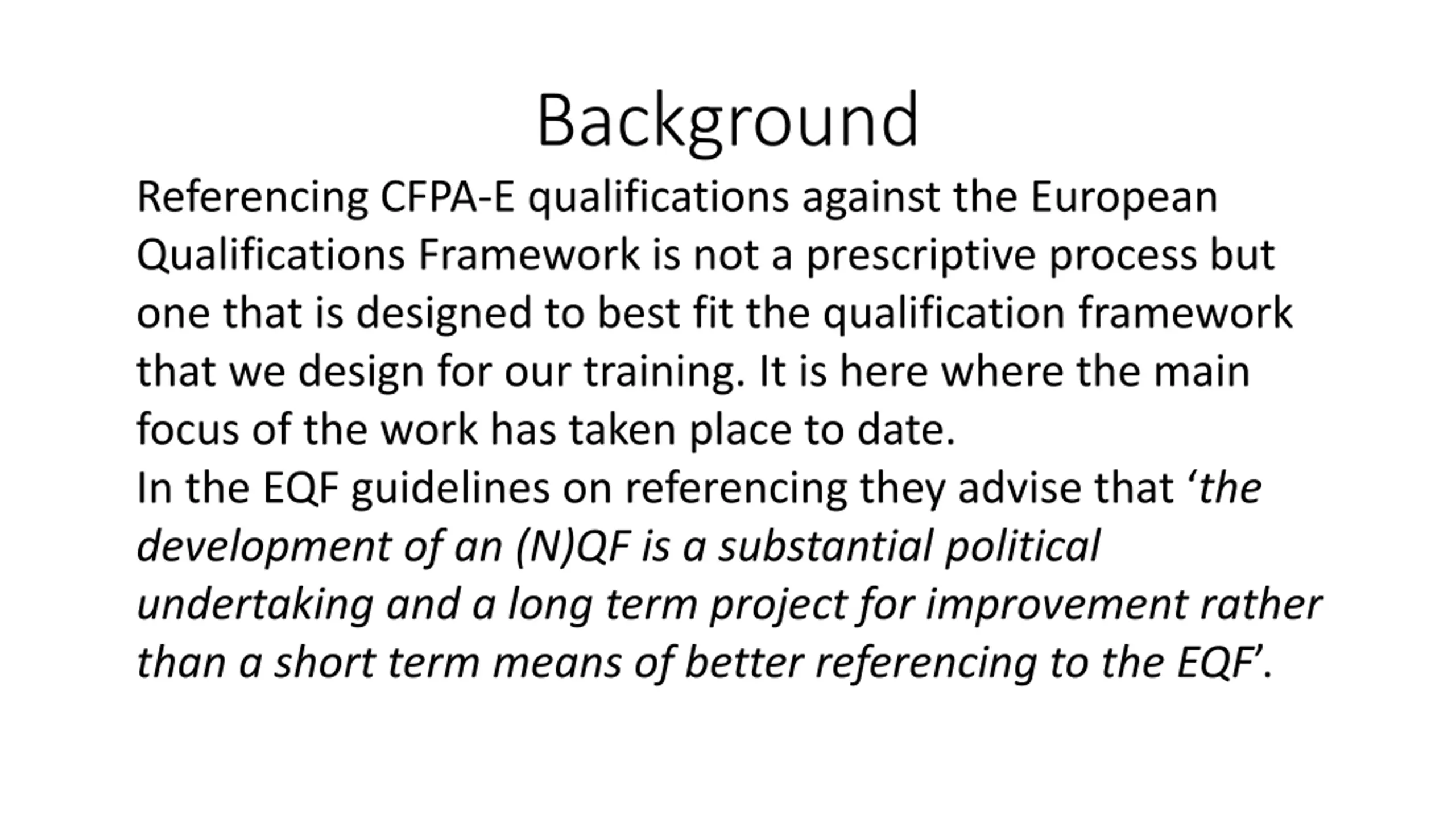Background Referencing CFPA-E qualifications against the European Qualifications Framework is not a prescriptive process but one that is designed to best fit the qualification framework that we design for our training. It is here where the main focus of the work has taken place to date. In the EQF guidelines on referencing they advise that the development of an (N)QF is a substantial political undertaking and a long term project for improvement rather than a short term means of better referencing to the EQF .