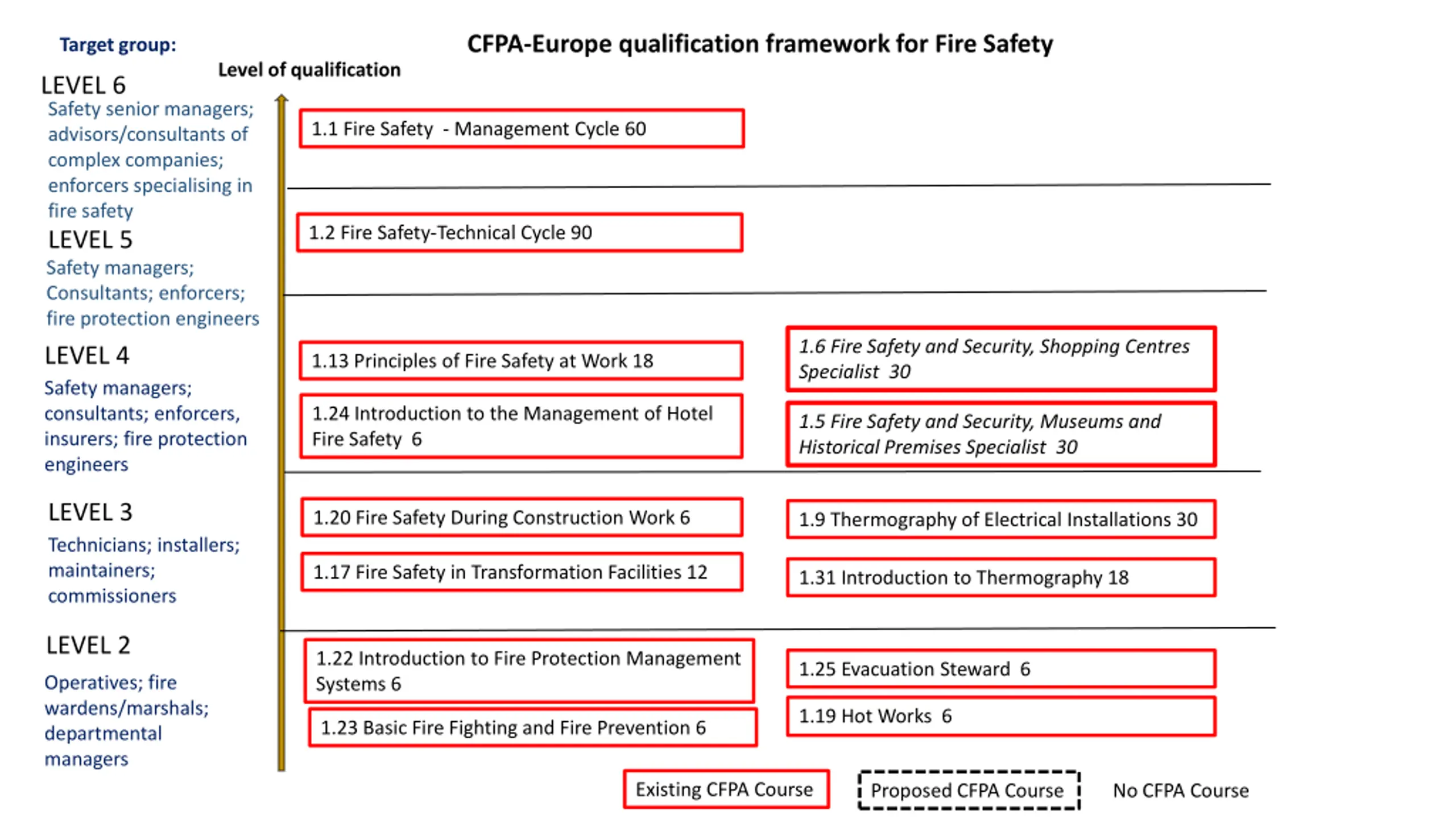CFPA-Europe qualification framework for Fire Safety Target group: Level of qualification LEVEL 6 Safety senior managers; advisors/consultants of complex companies; enforcers specialising in fire safety 1.1 Fire Safety - Management Cycle 60 1.2 Fire Safety-Technical Cycle 90 LEVEL 5 Safety managers; Consultants; enforcers; fire protection engineers 1.6 Fire Safety and Security, Shopping Centres Specialist 30 LEVEL 4 1.13 Principles of Fire Safety at Work 18 Safety managers; consultants; enforcers, insurers; fire protection engineers 1.24 Introduction to the Management of Hotel Fire Safety 6 1.5 Fire Safety and Security, Museums and Historical Premises Specialist 30 LEVEL 3 1.20 Fire Safety During Construction Work 6 1.9 Thermography of Electrical Installations 30 Technicians; installers; maintainers; commissioners 1.17 Fire Safety in Transformation Facilities 12 1.31 Introduction to Thermography 18 LEVEL 2 1.22 Introduction to Fire Protection Management Systems 6 1.25 Evacuation Steward 6 Operatives; fire wardens/marshals; departmental managers 1.19 Hot Works 6 1.23 Basic Fire Fighting and Fire Prevention 6 Existing CFPA Course Proposed CFPA Course No CFPA Course