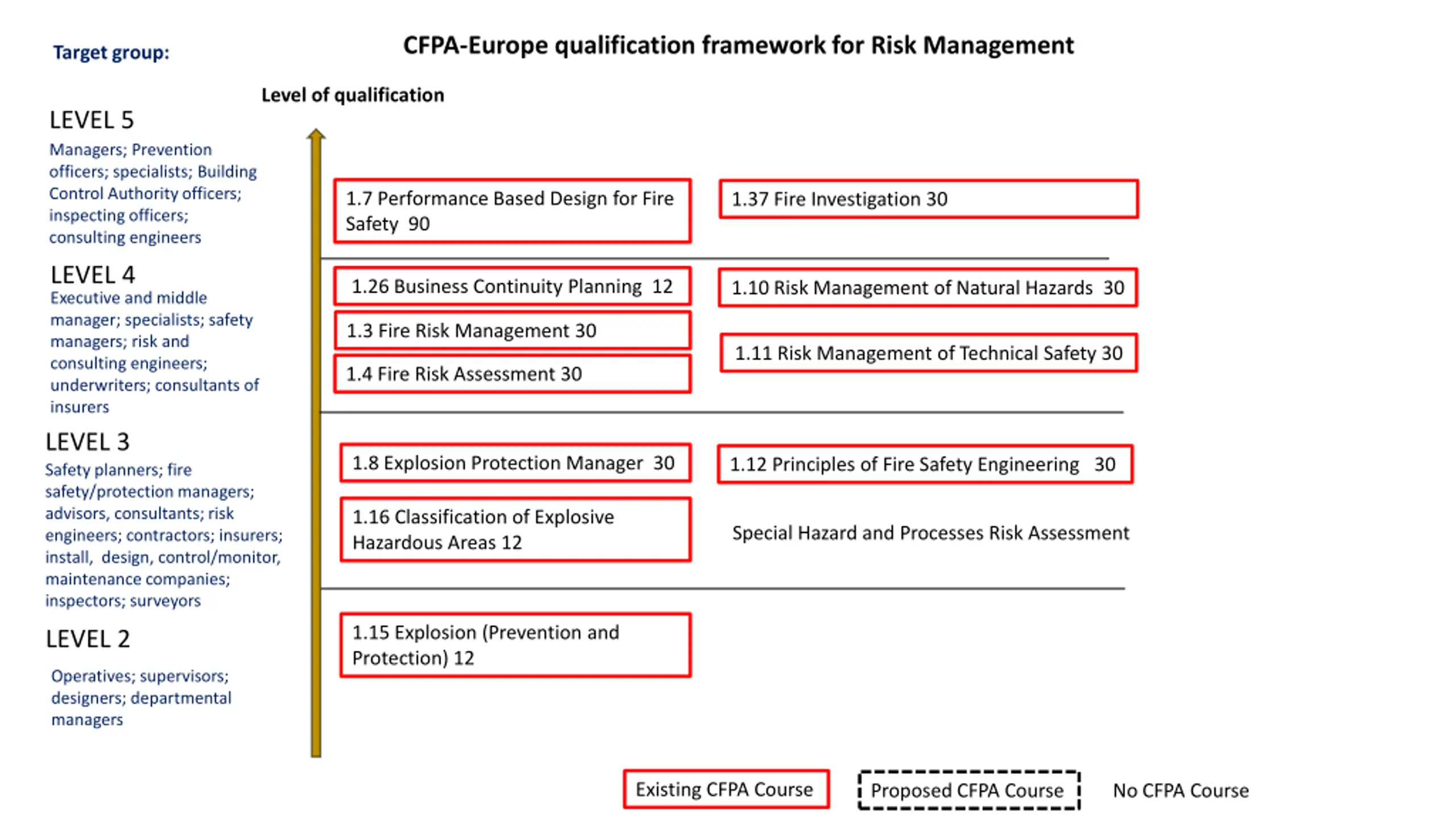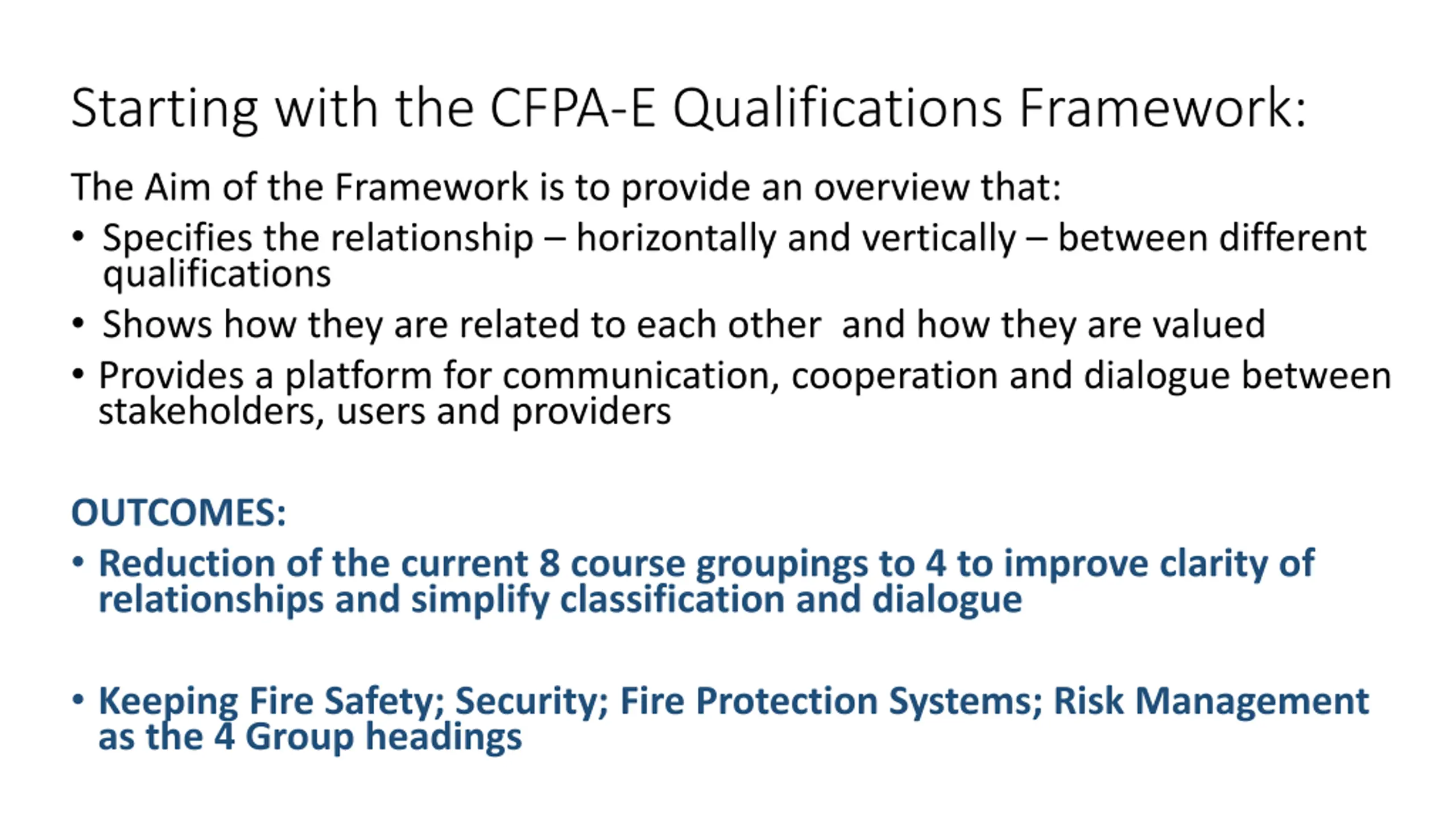 Starting with the CFPA-E Qualifications Framework: The Aim of the Framework is to provide an overview that: Specifies the relationship horizontally and vertically between different qualifications Shows how they are related to each other and how they are valued Provides a platform for communication, cooperation and dialogue between stakeholders, users and providers OUTCOMES: Reduction of the current 8 course groupings to 4 to improve clarity of relationships and simplify classification and dialogue Keeping Fire Safety; Security; Fire Protection Systems; Risk Management as the 4 Group headings