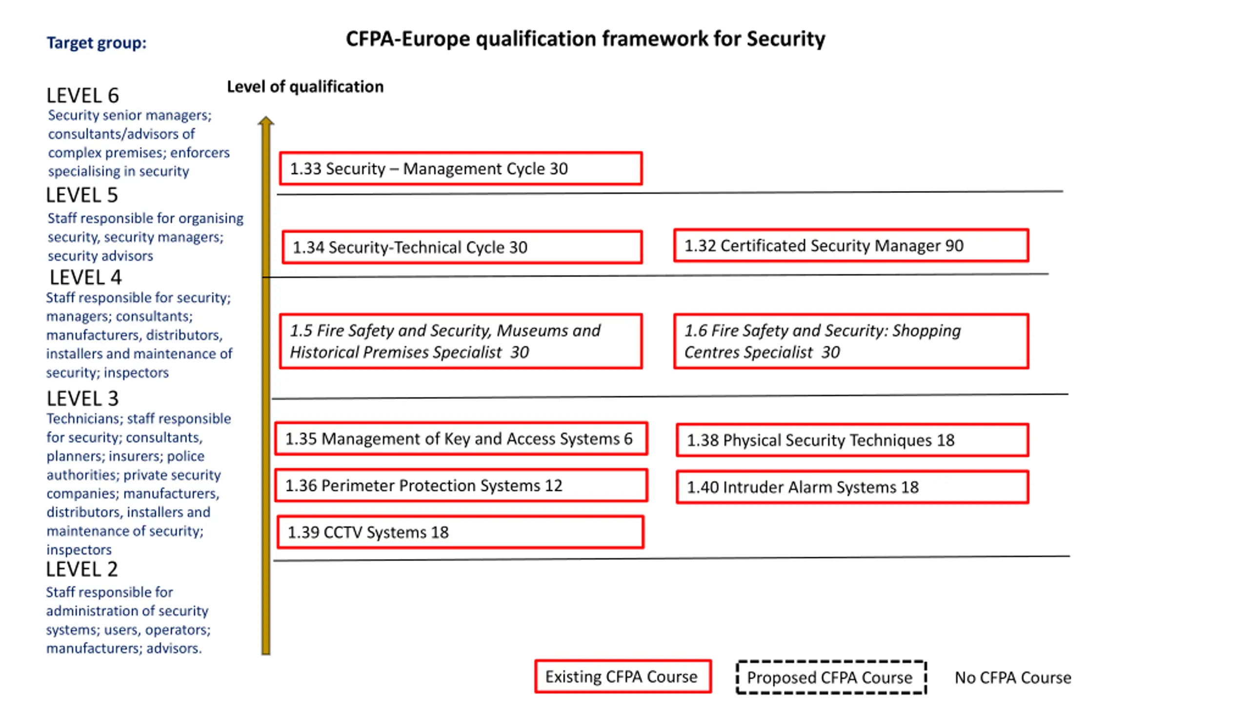 CFPA-Europe qualification framework for Security Target group: Level of qualification LEVEL 6 Security senior managers; consultants/advisors of complex premises; enforcers specialising in security 1.33 Security Management Cycle 30 LEVEL 5 Staff responsible for organising security, security managers; security advisors 1.32 Certificated Security Manager 90 1.34 Security-Technical Cycle 30 LEVEL 4 Staff responsible for security; managers; consultants; manufacturers, distributors, installers and maintenance of security; inspectors LEVEL 3 1.5 Fire Safety and Security, Museums and Historical Premises Specialist 30 1.6 Fire Safety and Security: Shopping Centres Specialist 30 Technicians; staff responsible for security; consultants, planners; insurers; police authorities; private security companies; manufacturers, distributors, installers and maintenance of security; inspectors LEVEL 2 Staff responsible for administration of security systems; users, operators; manufacturers; advisors. 1.35 Management of Key and Access Systems 6 1.38 Physical Security Techniques 18 1.36 Perimeter Protection Systems 12 1.40 Intruder Alarm Systems 18 1.39 CCTV Systems 18 Existing CFPA Course Proposed CFPA Course No CFPA Course