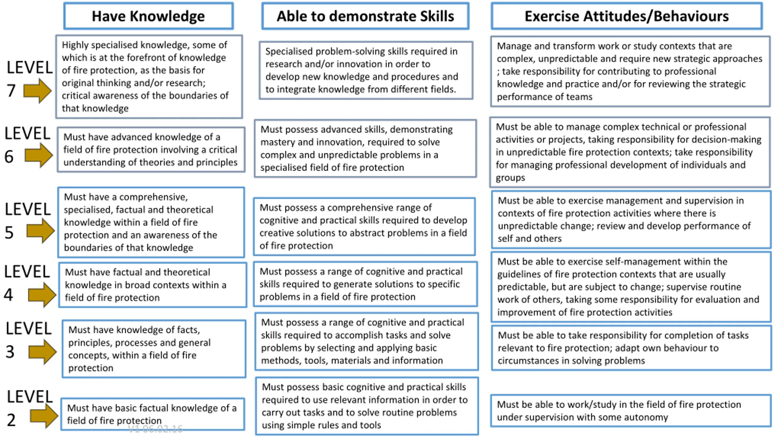 Have Knowledge Able to demonstrate Skills Exercise Attitudes/Behaviours Highly specialised knowledge, some of which is at the forefront of knowledge of fire protection, as the basis for original thinking and/or research; critical awareness of the boundaries of that knowledge Manage and transform work or study contexts that are complex, unpredictable and require new strategic approaches ; take responsibility for contributing to professional knowledge and practice and/or for reviewing the strategic performance of teams Specialised problem-solving skills required in research and/or innovation in order to develop new knowledge and procedures and to integrate knowledge from different fields. LEVEL 7 Must be able to manage complex technical or professional activities or projects, taking responsibility for decision-making in unpredictable fire protection contexts; take responsibility for managing professional development of individuals and groups LEVEL 6 Must possess advanced skills, demonstrating mastery and innovation, required to solve complex and unpredictable problems in a specialised field of fire protection Must have advanced knowledge of a field of fire protection involving a critical understanding of theories and principles Must have a comprehensive, specialised, factual and theoretical knowledge within a field of fire protection and an awareness of the boundaries of that knowledge Must be able to exercise management and supervision in contexts of fire protection activities where there is unpredictable change; review and develop performance of self and others LEVEL 5 Must possess a comprehensive range of cognitive and practical skills required to develop creative solutions to abstract problems in a field of fire protection Must be able to exercise self-management within the guidelines of fire protection contexts that are usually predictable, but are subject to change; supervise routine work of others, taking some responsibility for evaluation and improvement of fire protection activities LEVEL 4 Must possess a range of cognitive and practical skills required to generate solutions to specific problems in a field of fire protection Must have factual and theoretical knowledge in broad contexts within a field of fire protection Must possess a range of cognitive and practical skills required to accomplish tasks and solve problems by selecting and applying basic methods, tools, materials and information LEVEL 3 Must have knowledge of facts, principles, processes and general concepts, within a field of fire protection Must be able to take responsibility for completion of tasks relevant to fire protection; adapt own behaviour to circumstances in solving problems Must possess basic cognitive and practical skills required to use relevant information in order to carry out tasks and to solve routine problems using simple rules and tools LEVEL 2 Must be able to work/study in the field of fire protection under supervision with some autonomy Must have basic factual knowledge of a field of fire protection V1 06.02.16