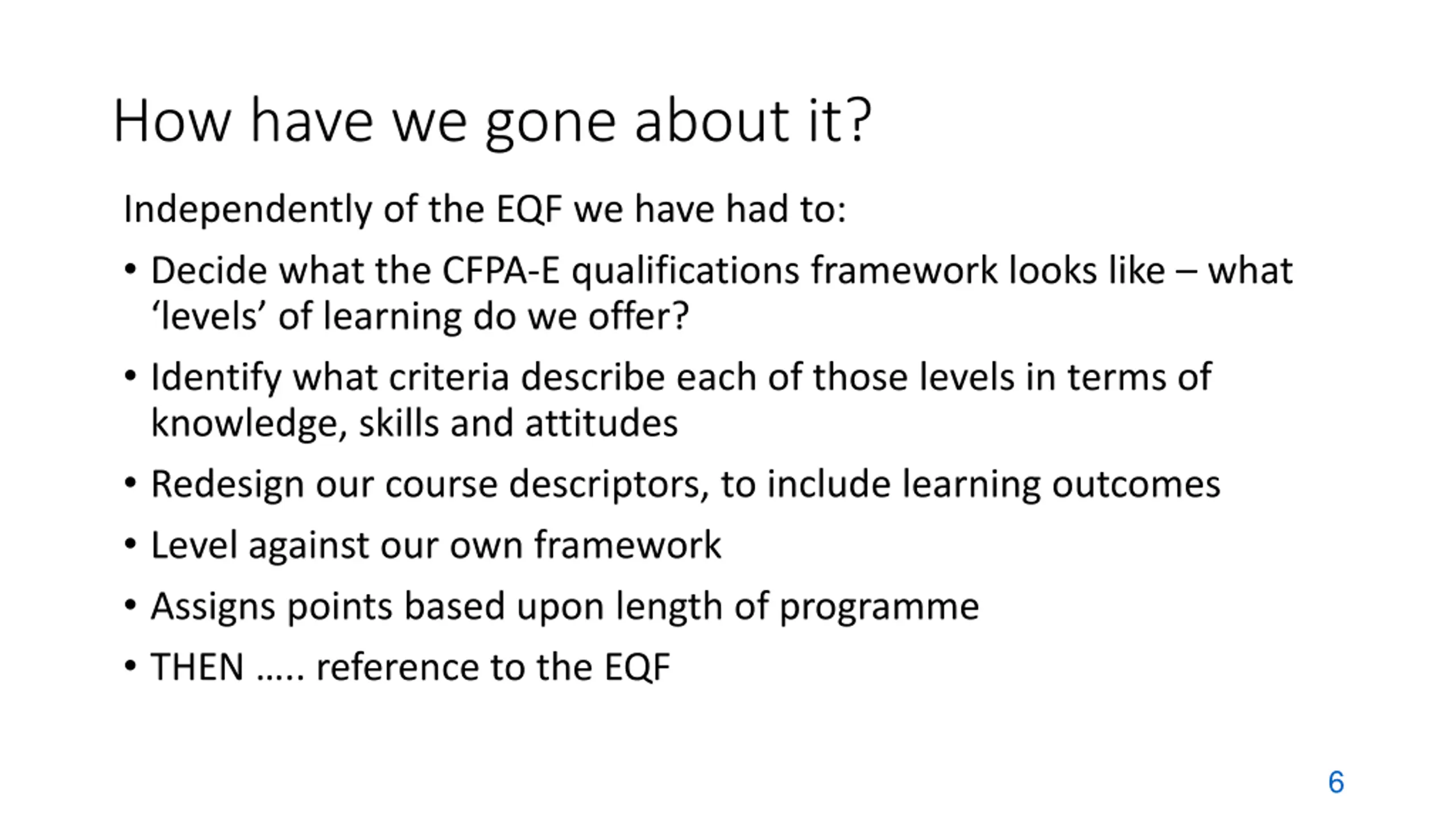 How have we gone about it? Independently of the EQF we have had to: Decide what the CFPA-E qualifications framework looks like what levels of learning do we offer? Identify what criteria describe each of those levels in terms of knowledge, skills and attitudes Redesign our course descriptors, to include learning outcomes Level against our own framework Assigns points based upon length of programme THEN .. reference to the EQF 6