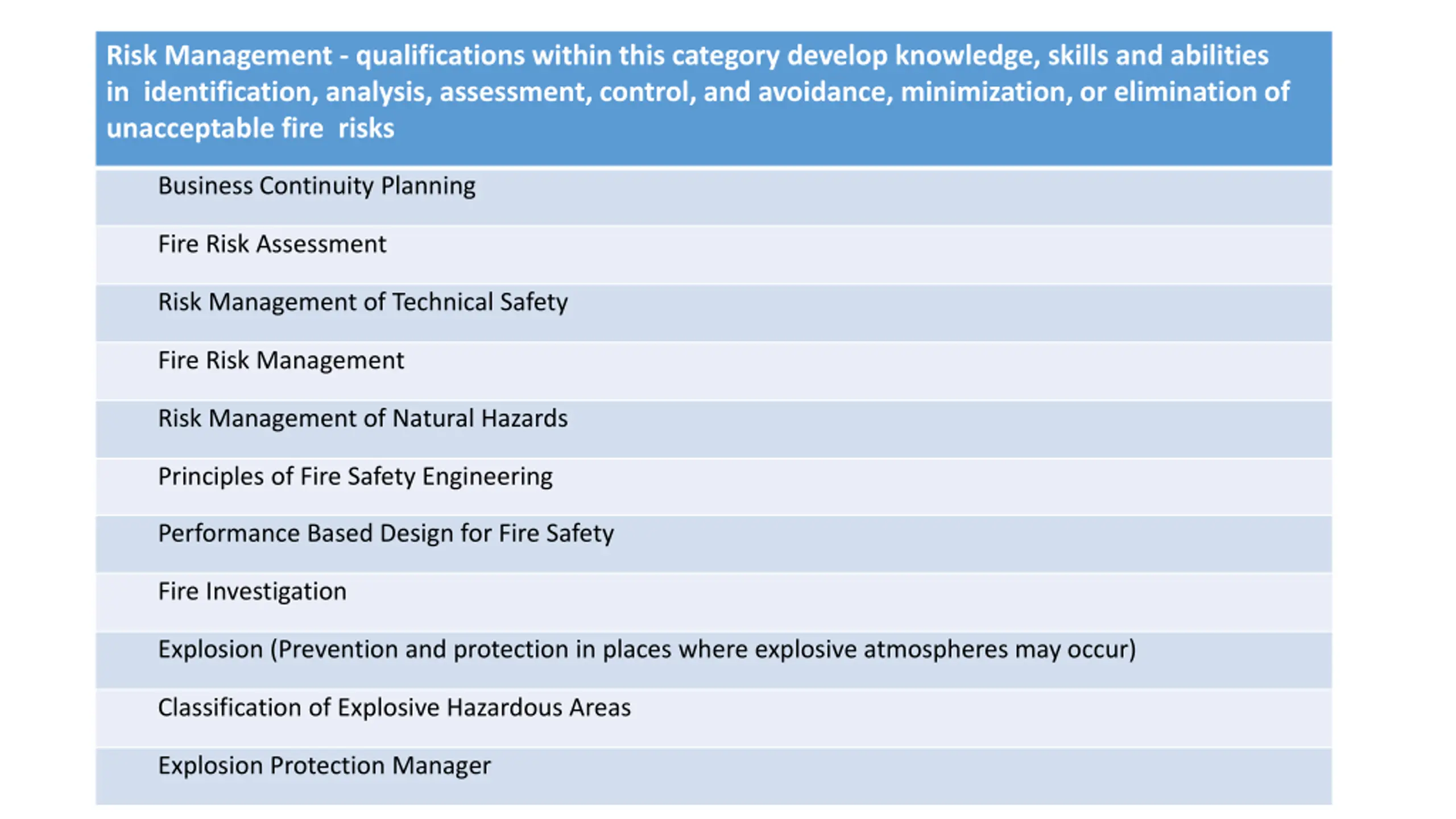 Risk Management - qualifications within this category develop knowledge, skills and abilities in identification, analysis, assessment, control, and avoidance, minimization, or elimination of unacceptable fire risks Business Continuity Planning Fire Risk Assessment Risk Management of Technical Safety Fire Risk Management Risk Management of Natural Hazards Principles of Fire Safety Engineering Performance Based Design for Fire Safety Fire Investigation Explosion (Prevention and protection in places where explosive atmospheres may occur) Classification of Explosive Hazardous Areas Explosion Protection Manager