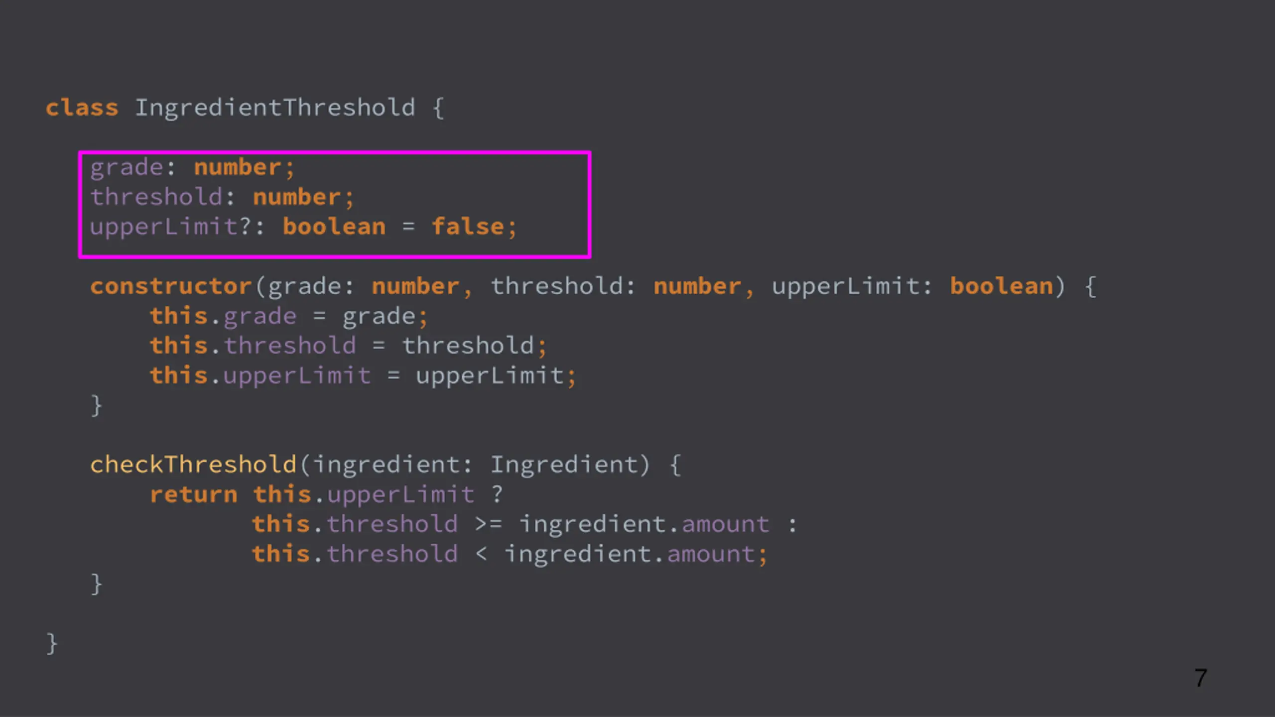 class IngredientThreshold { grade: number; threshold: number; upperLimit?: boolean = false; constructor(grade: number, threshold: number, upperLimit: boolean) { this.grade = grade; this.threshold = threshold; this.upperLimit = upperLimit; } checkThreshold(ingredient: Ingredient) { return this.upperLimit ? this.threshold >= ingredient.amount : this.threshold < ingredient.amount; } } 7