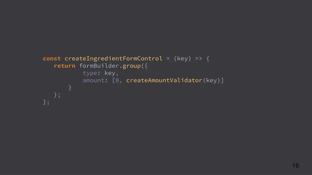 const createIngredientFormControl = (key) => { return formBuilder.group({ type: key, amount: [0, createAmountValidator(key)] } ); }; 16