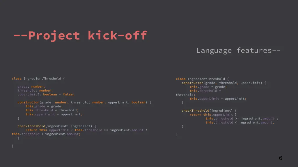 --Project kick-off Language features-- class IngredientThreshold { class IngredientThreshold { constructor(grade, threshold, upperLimit) { this.grade = grade; this.threshold = threshold; this.upperLimit = upperLimit; } grade: number; threshold: number; upperLimit?: boolean = false; constructor(grade: number, threshold: number, upperLimit: boolean) { this.grade = grade; this.threshold = threshold; this.upperLimit = upperLimit; } checkThreshold(ingredient) { return this.upperLimit ? this.threshold >= ingredient.amount : this.threshold < ingredient.amount; } checkThreshold(ingredient: Ingredient) { return this.upperLimit ? this.threshold >= ingredient.amount : this.threshold < ingredient.amount; } } } 6